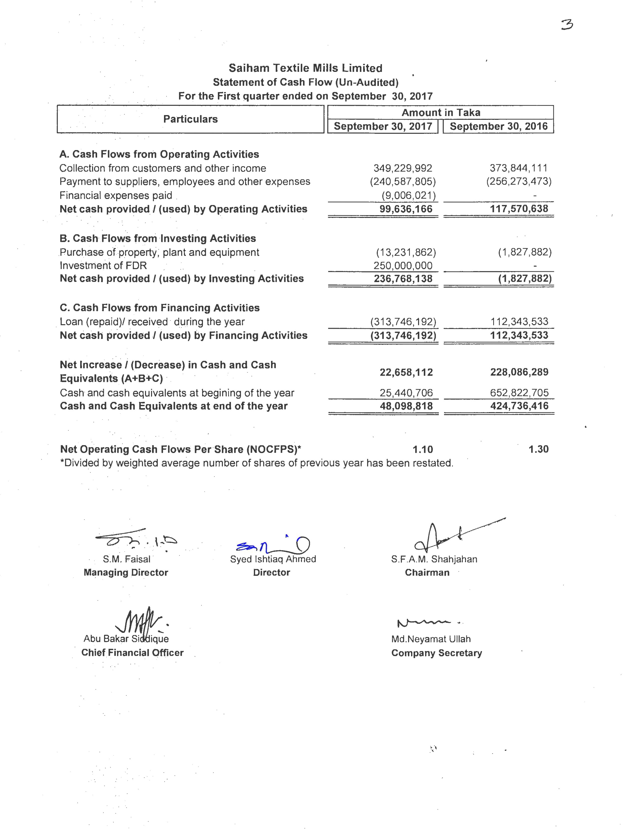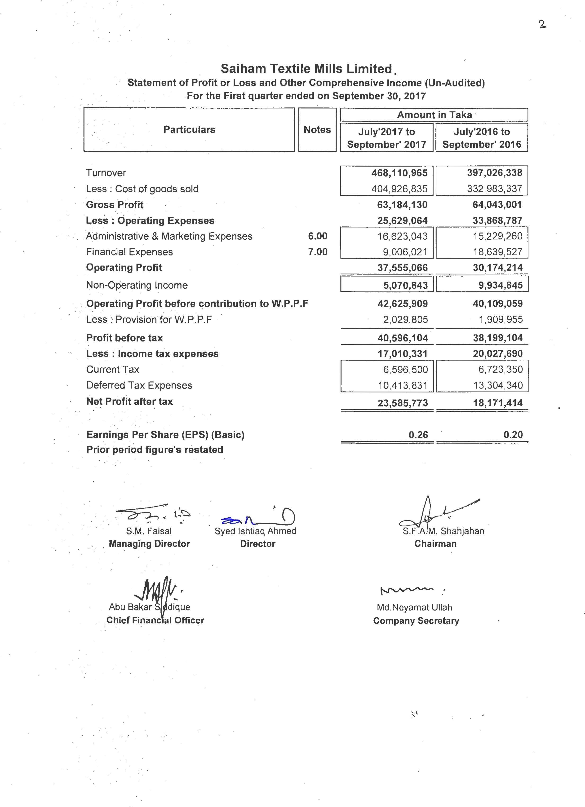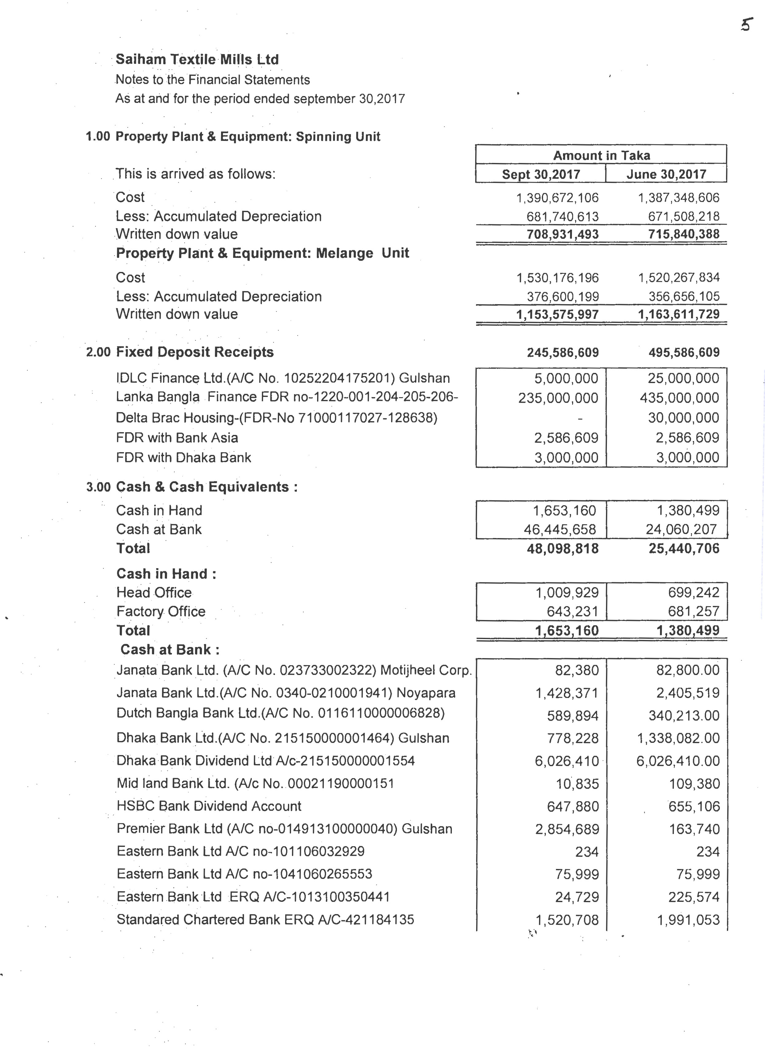 Saiham Textile Mills Ltd. Q2 Un-audited Financial Statements