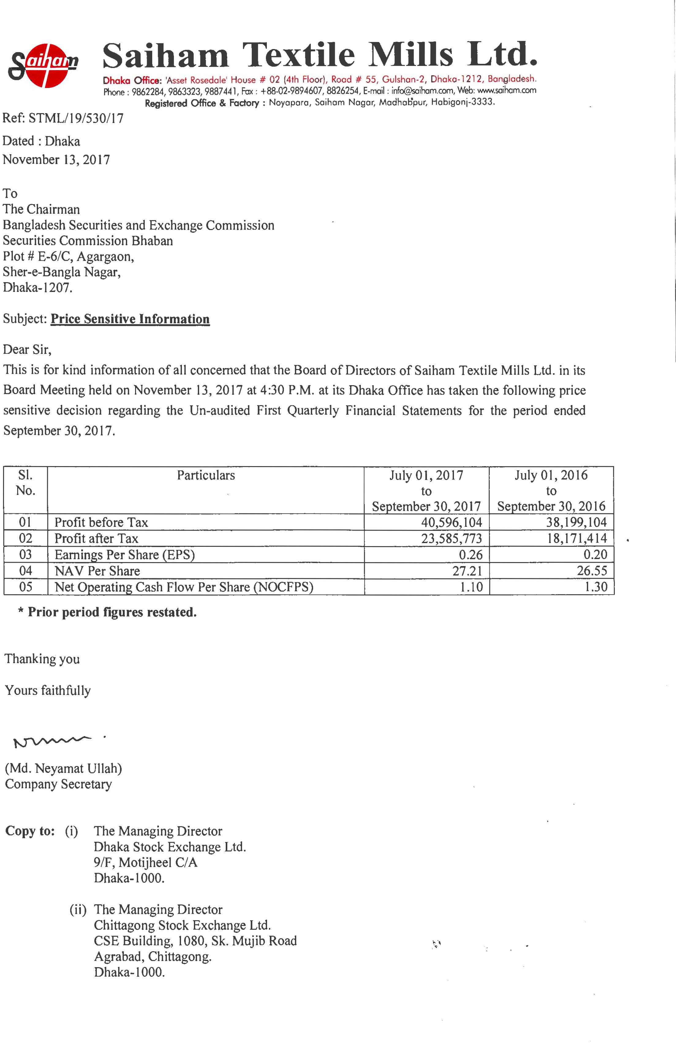 Price Sensitive Information of Saiham Textile Mills Ltd.