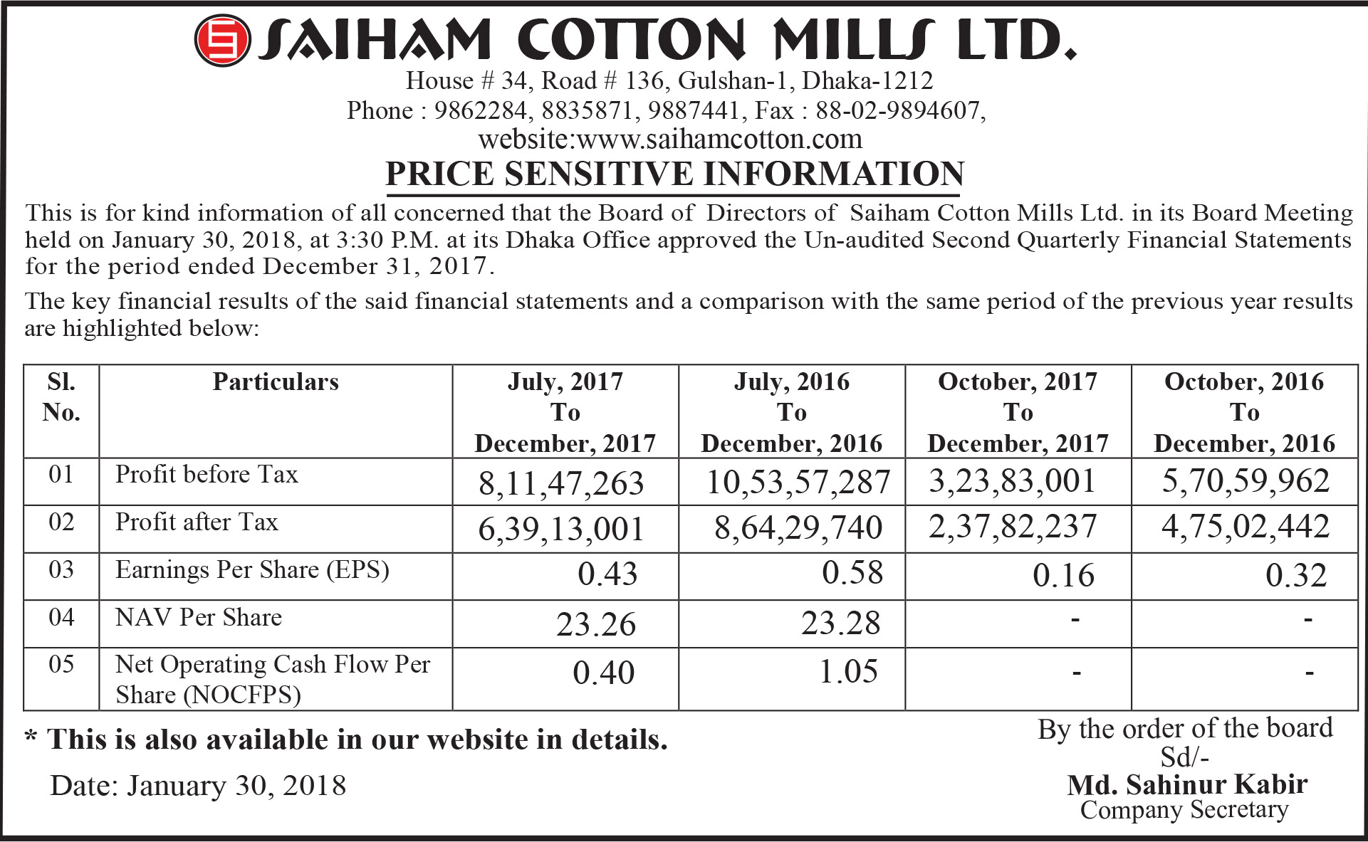 Saiham Cotton Mills Ltd. Q2 Un-audited Financial Statements