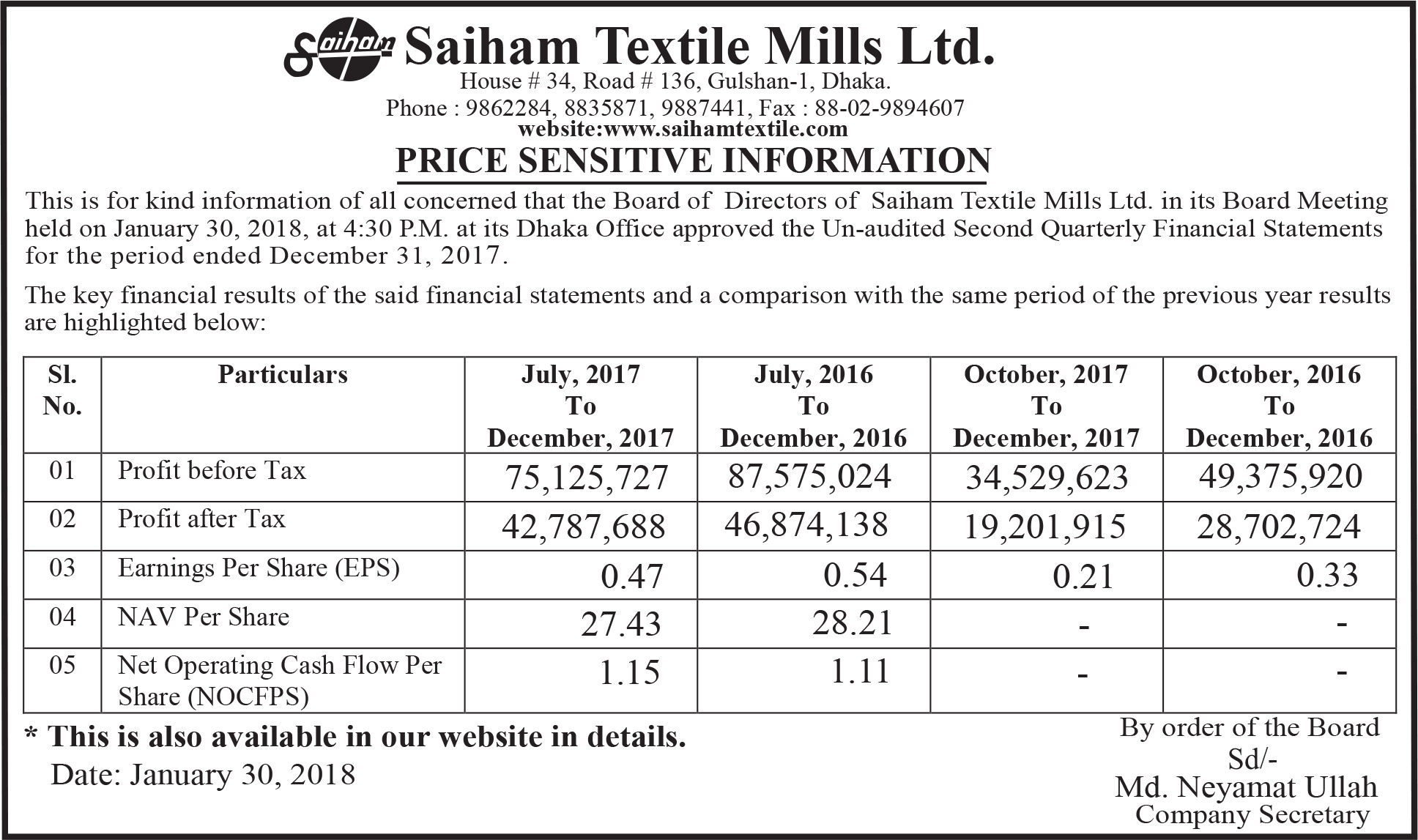 Saiham Textile Mills Ltd. Q2 Un-audited Financial Statements
