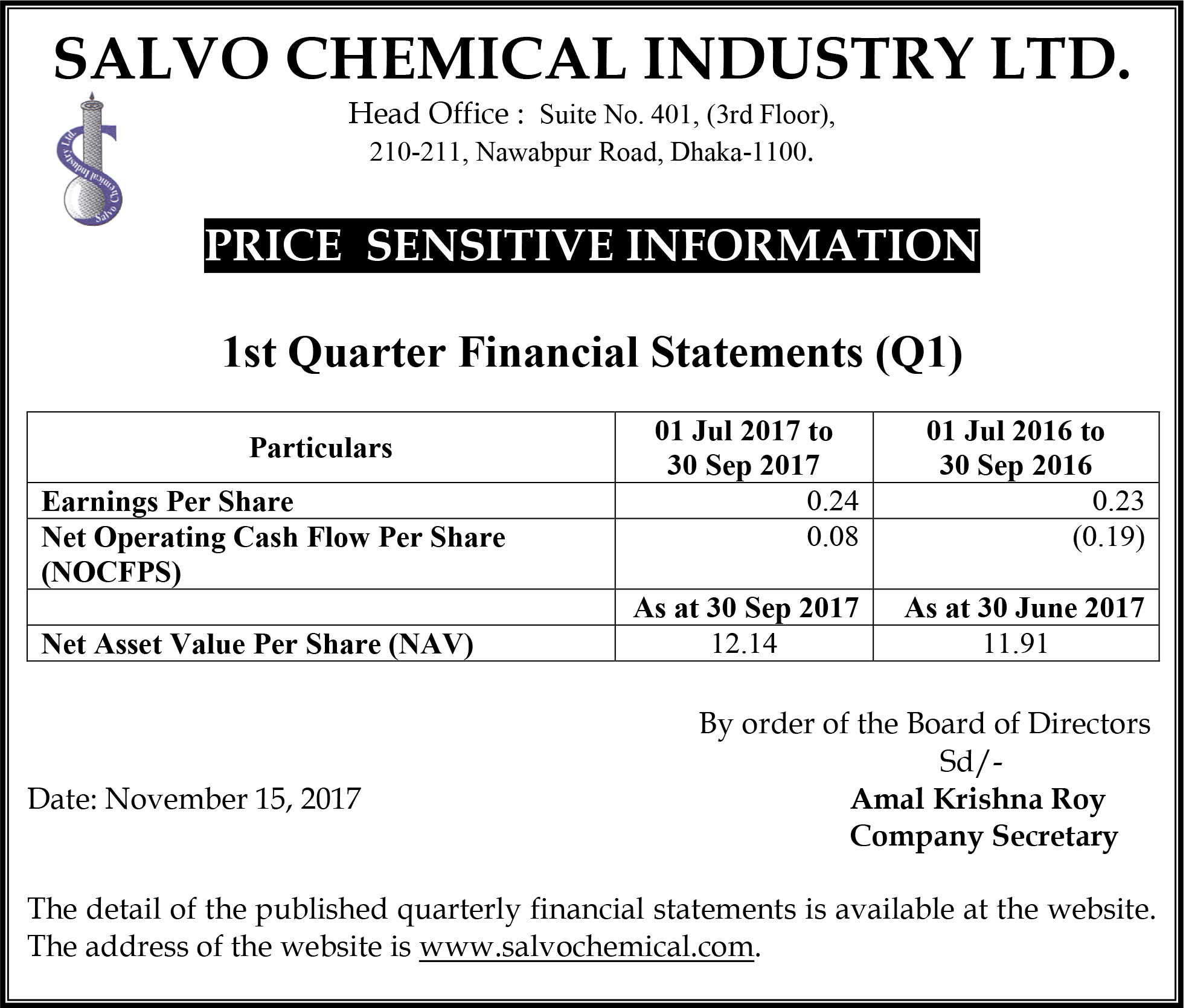 Salvo Chemical Industry Limited Q1 Financial Statements