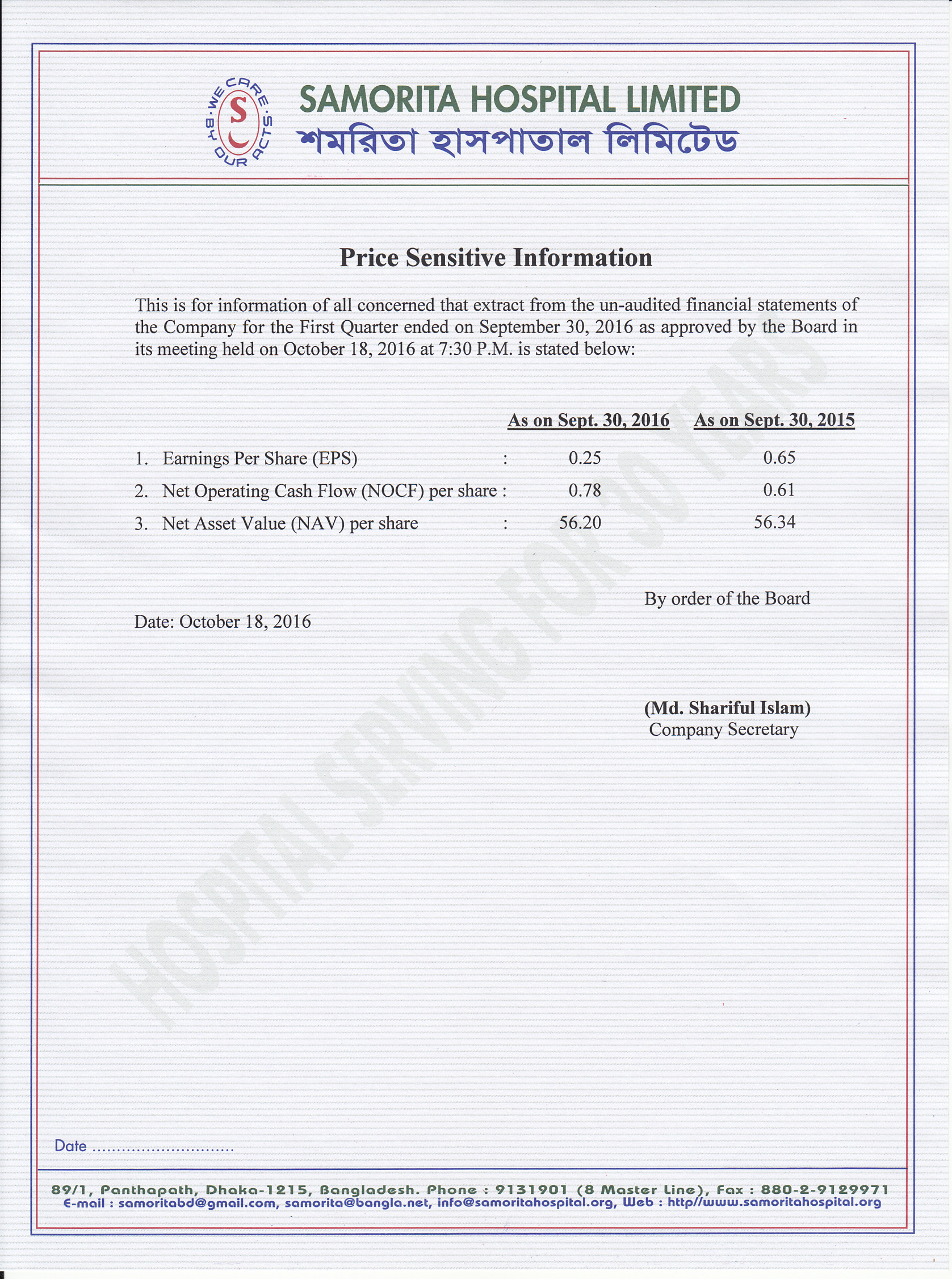 Samorita Hospital Limited First Quarter Price Sensitive Information