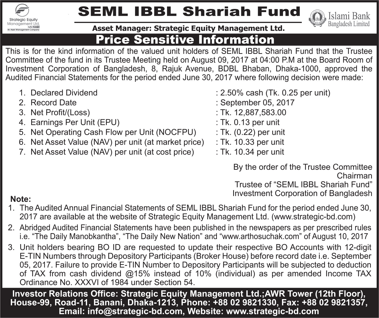 Price Sensitive Information of SEML IBBL Shariah Fund