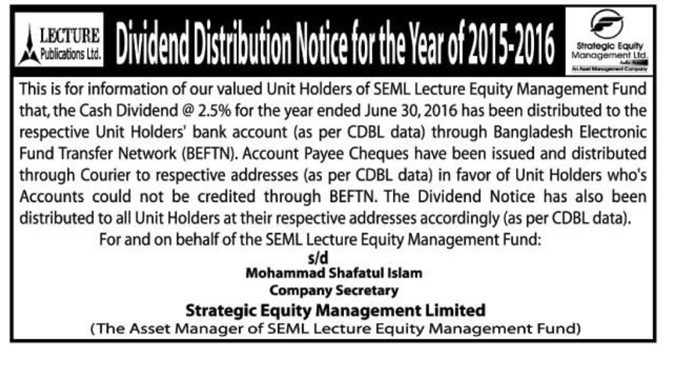 SEML Lecture Equity Management Fund Dividend Distribution Notice for the Year 2015-16