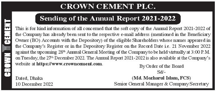 Sending of the Annual Report of Crown Cement PLC.