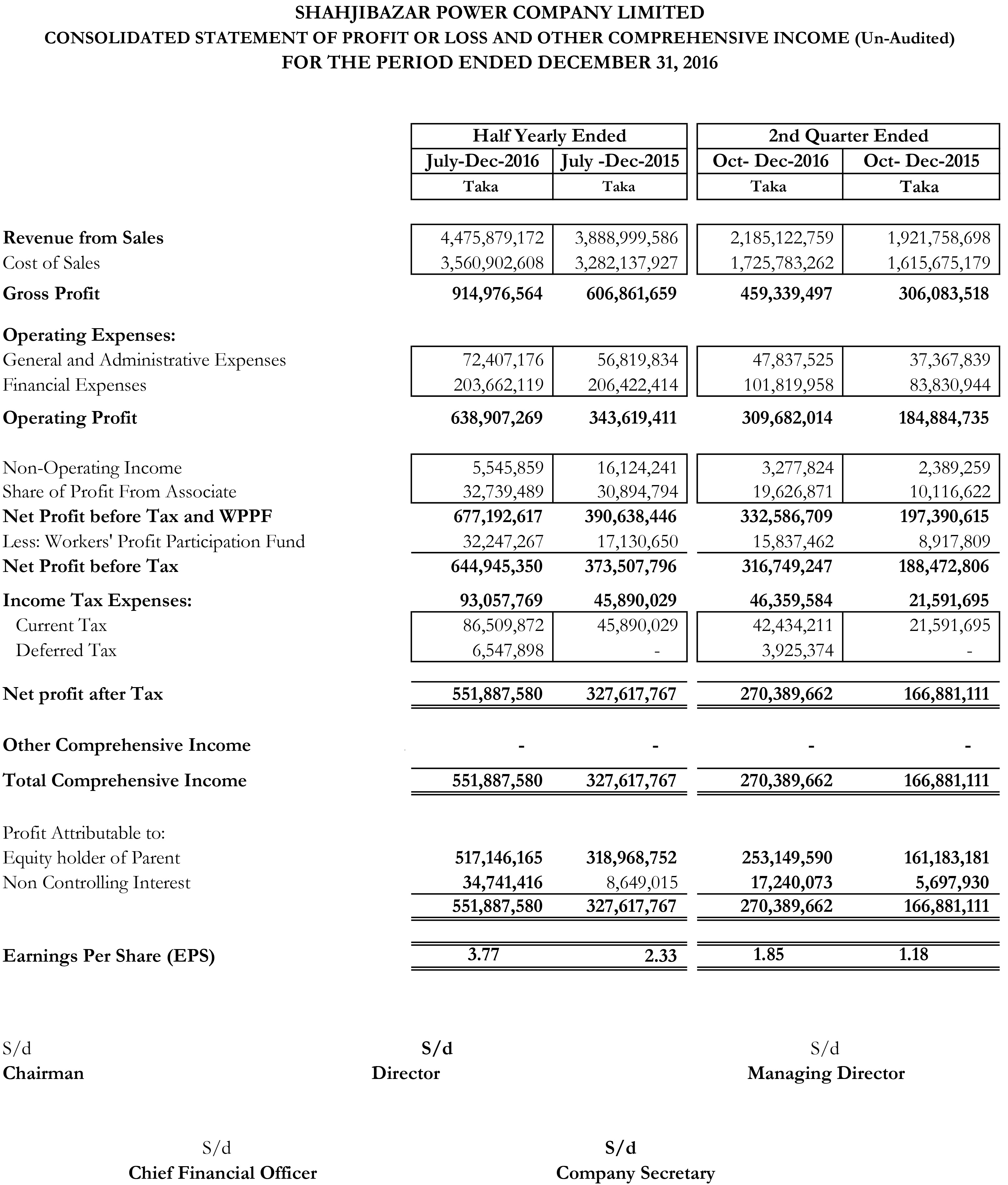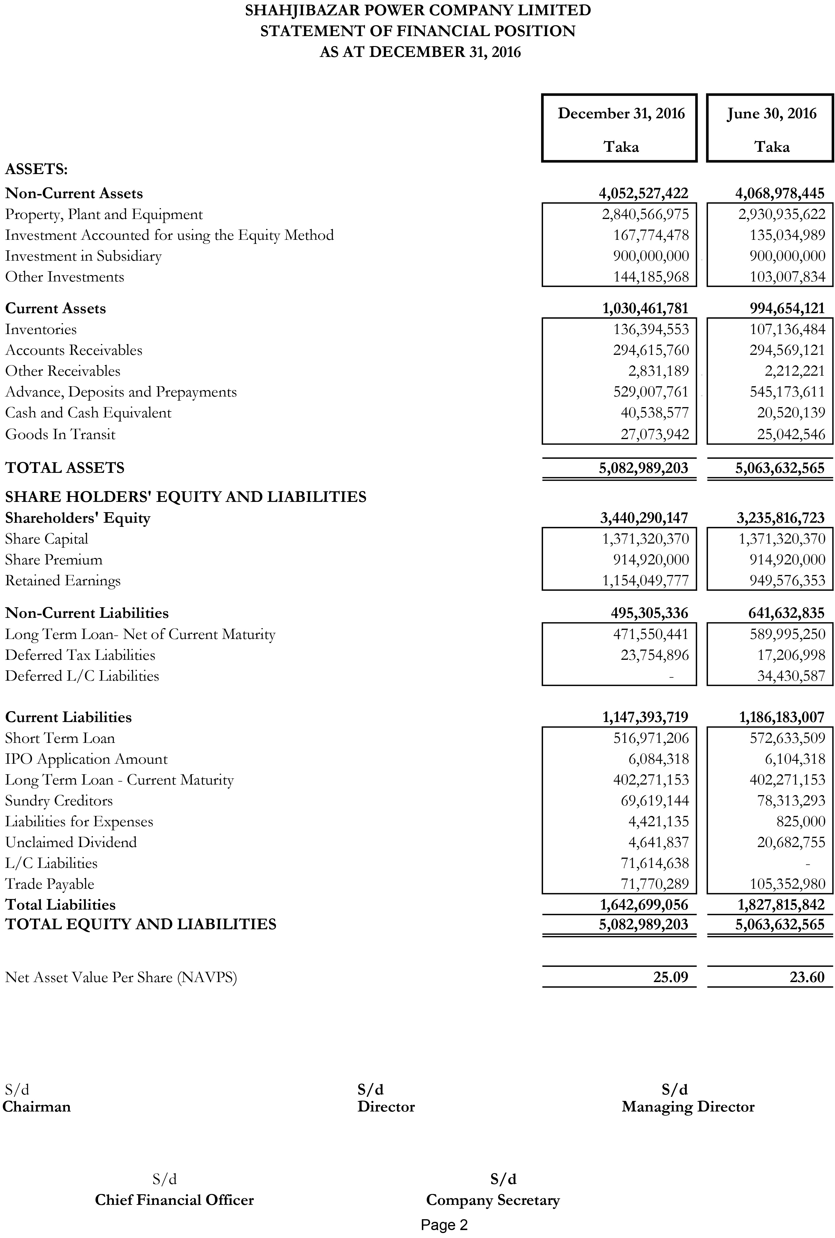 Q2 Un-audited Financial Statements of Shahjibazar Power Co. Ltd