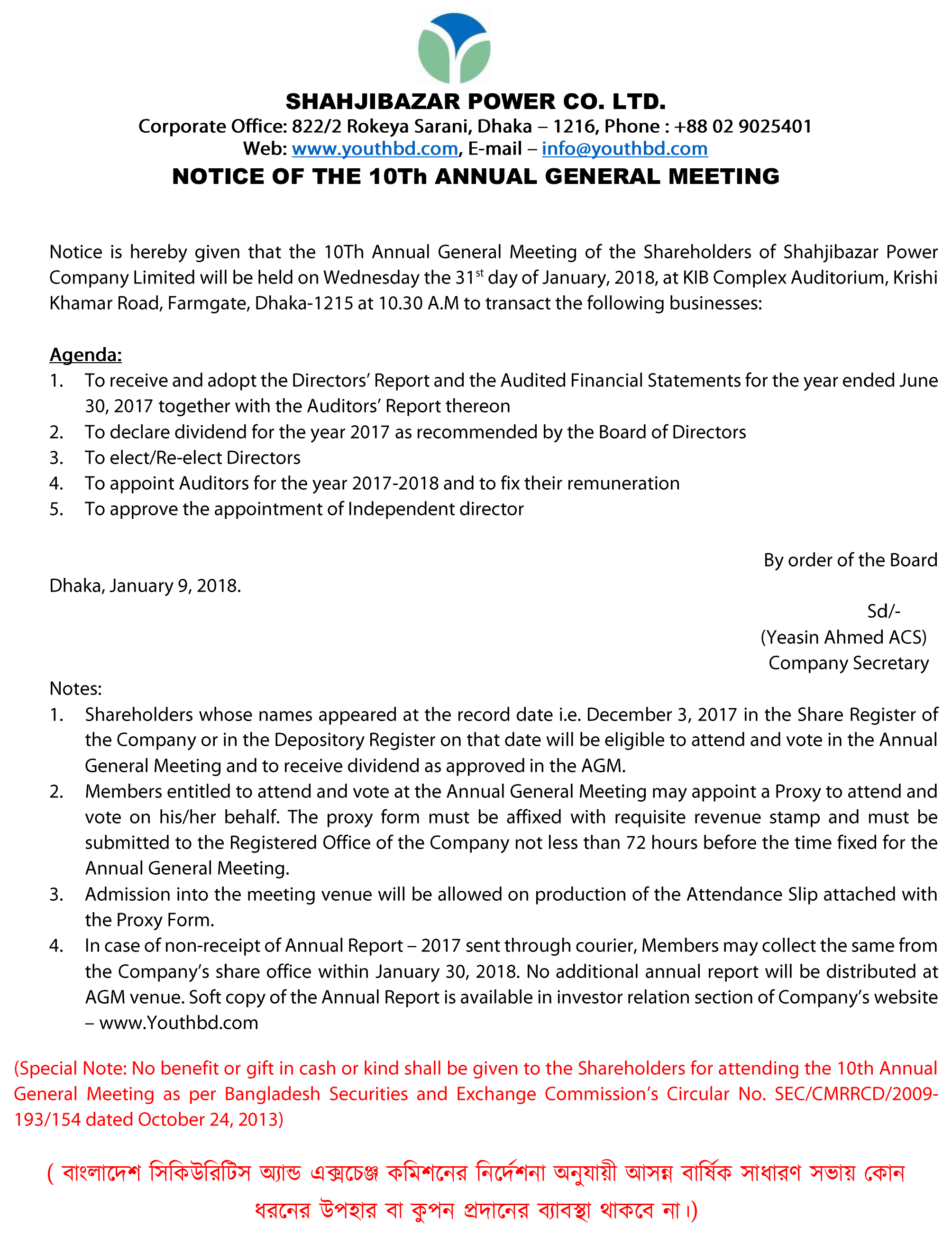 Shahjibazar Power Co. Ltd. Notice of 10th Annual General Meeting