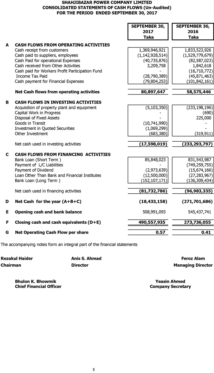 Q3 Un-audited Financial Statements of Shahjibazar Power Co. Ltd