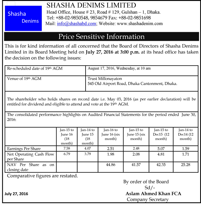 Price Sensitive Information of Shasha Denims PLC.