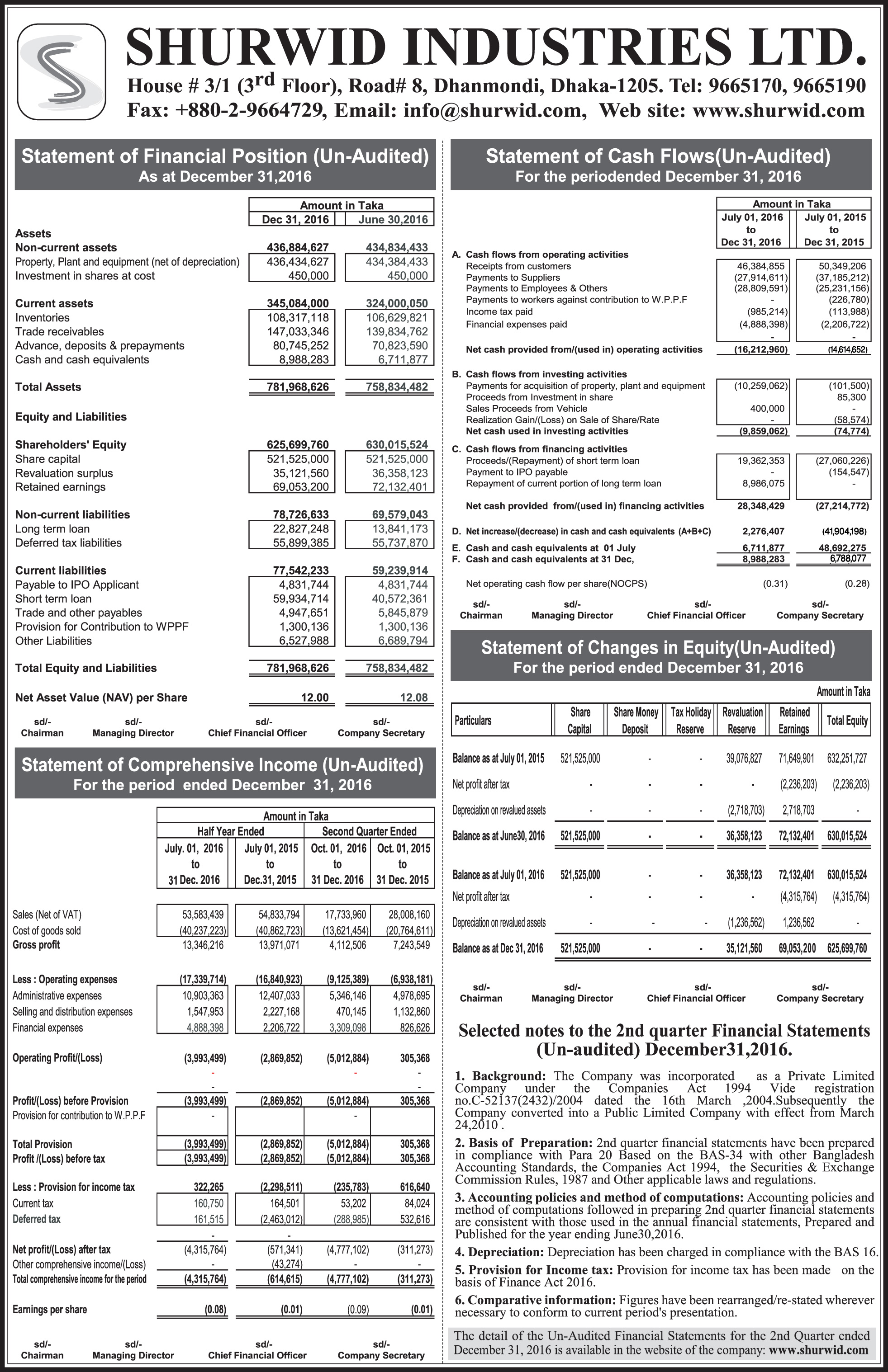 Price Sensitive Information Of Shurwid Industries Ltd 31 December 2015