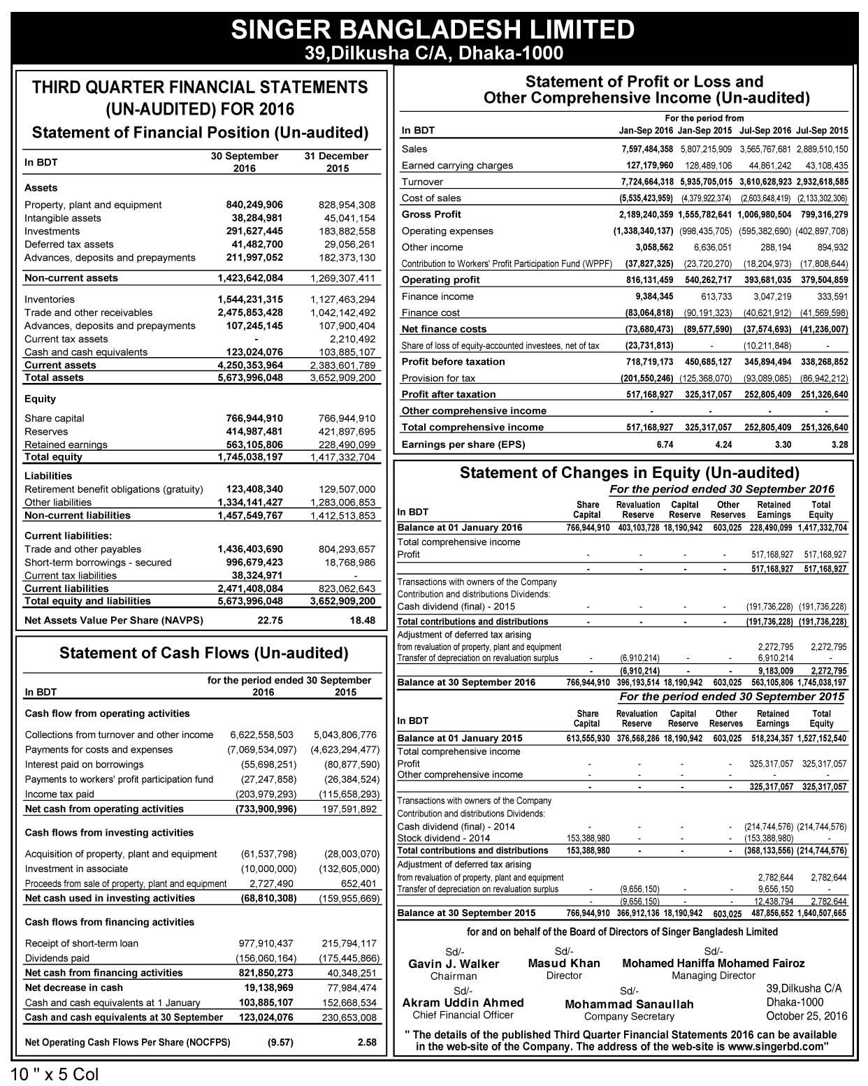 Singer Bangladesh 3rd Quarter Financial Statements 2016
