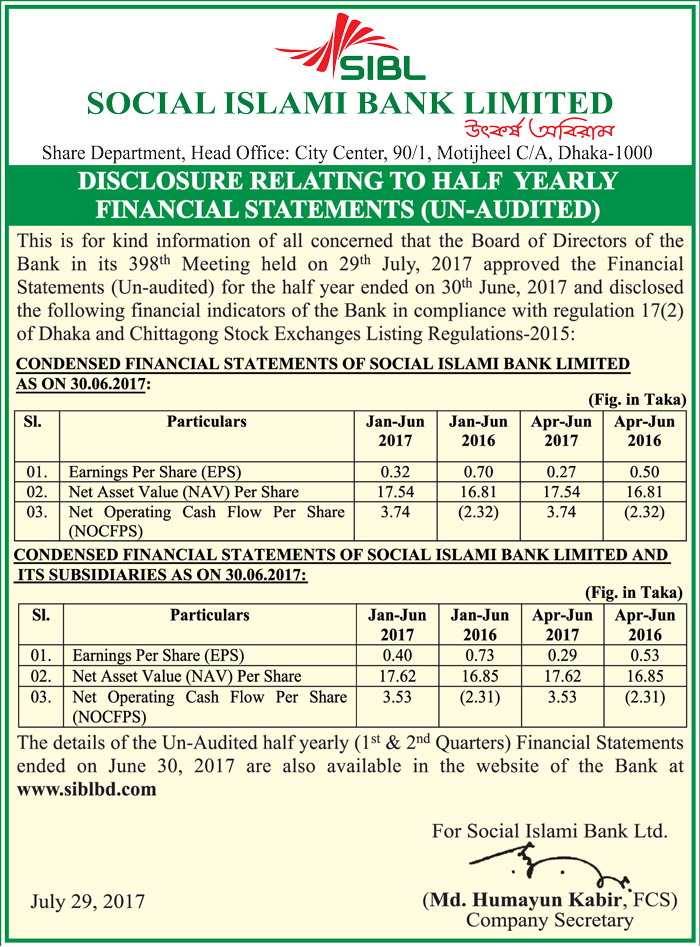 SOCIAL ISLAMI BANK LIMITED HALF YEARLY FINANCIAL STATEMENTS