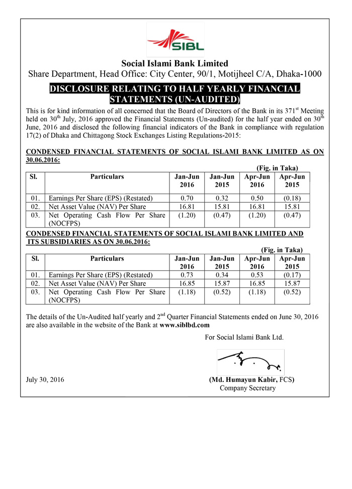 SOCIAL ISLAMI BANK LIMITED HALF YEARLY FINANCIAL STATEMENTS