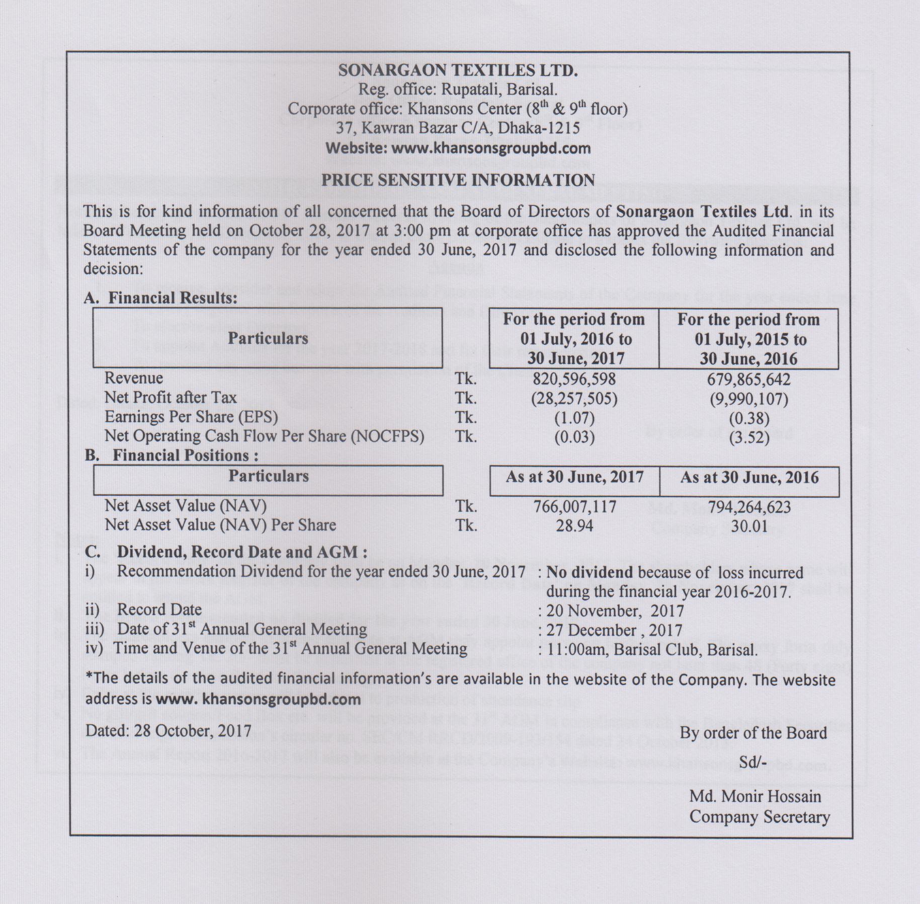 Price Sensitive Information Of Sonargaon Textiles LTD.