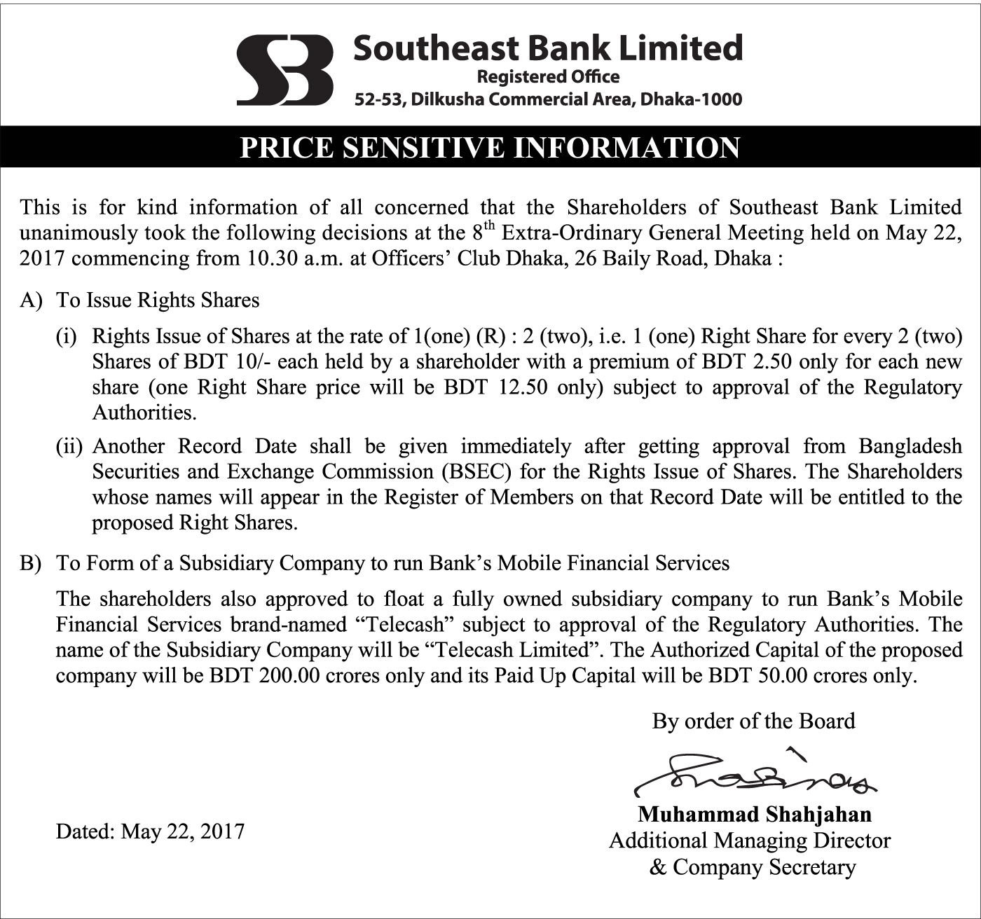 Refixation of Date of the 29th AGM of Southeast Bank PLC