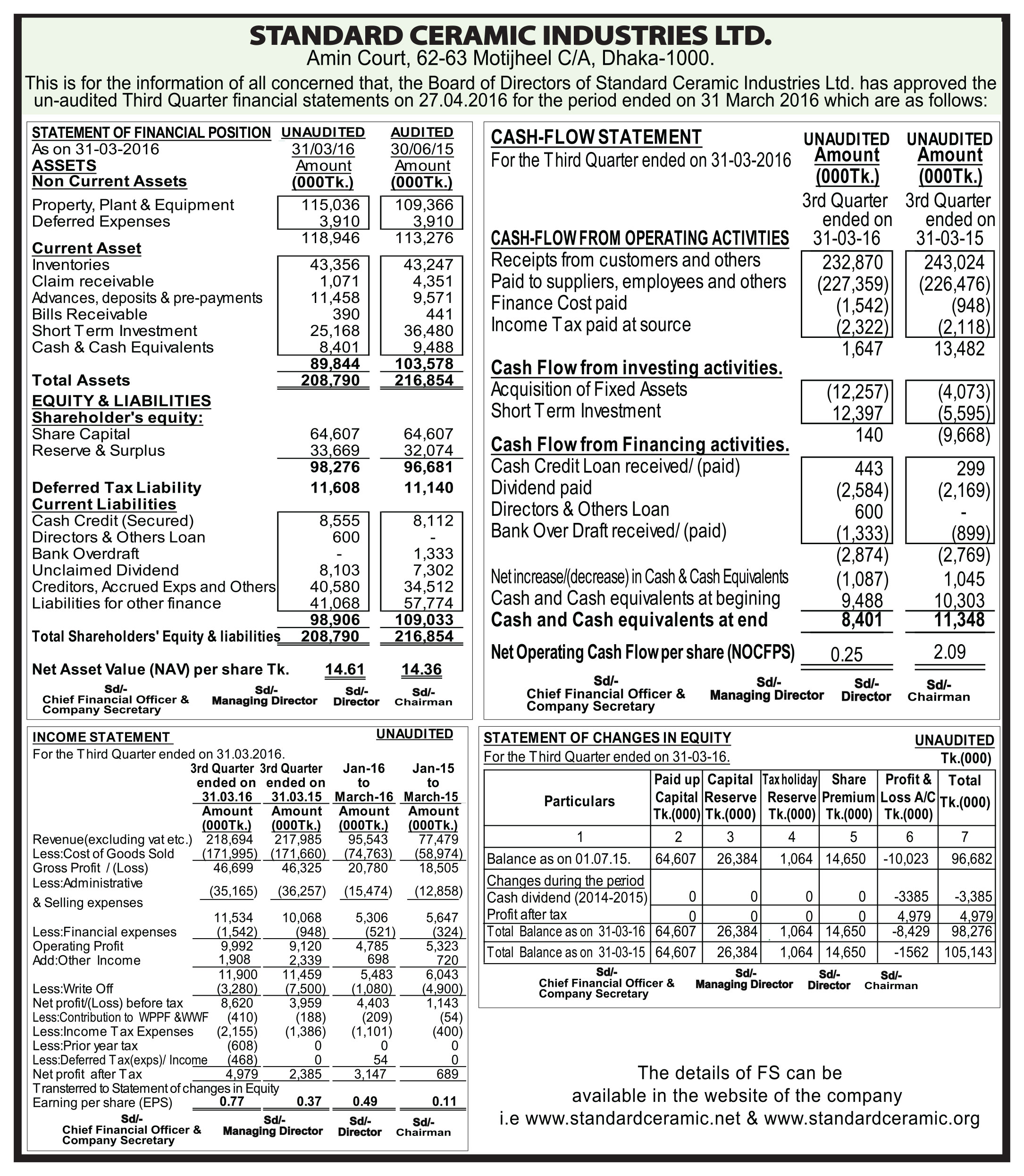 Standard Ceramic Industries Ltd 3Q Financial Statements
