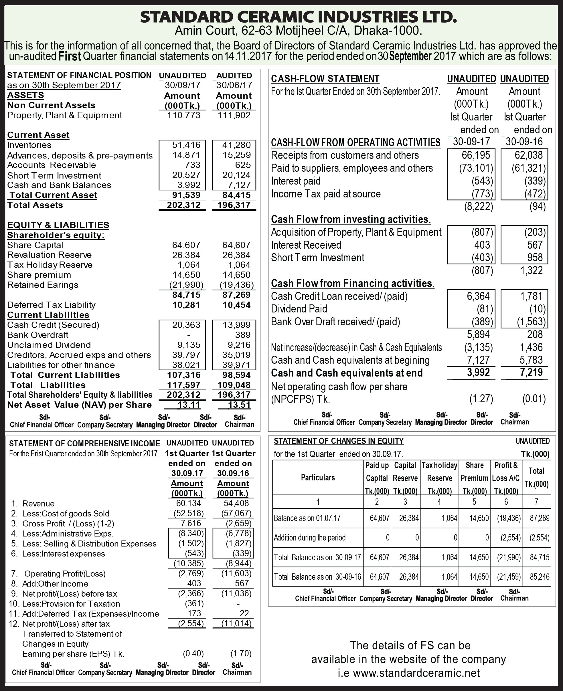 Standard Ceramic Industries Ltd Q1 Un-audited Financial Statements