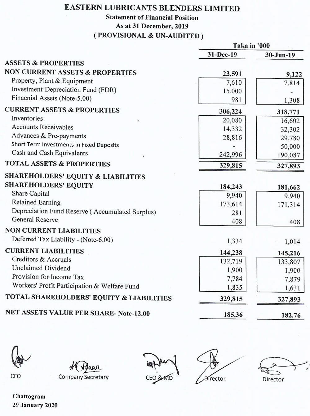 Statements of Financial Position (Provisional & Un-audited) of Eastern Lubricants Blenders Limited