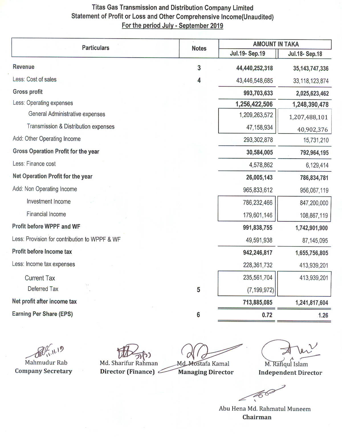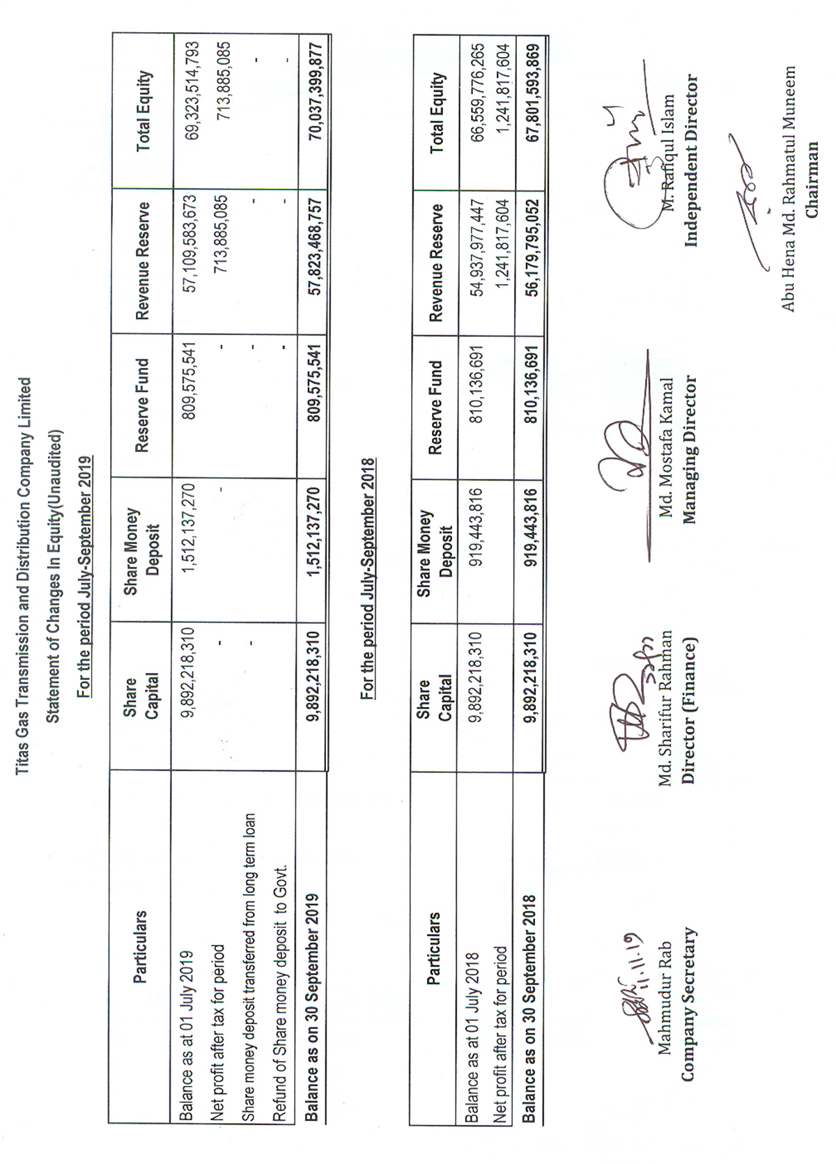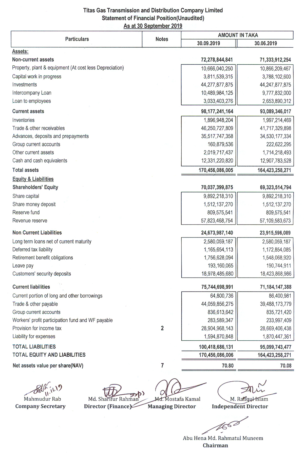Statement of Financial Position (Unaudited) of Titas Gas Transmission and Distribution Company Limited
