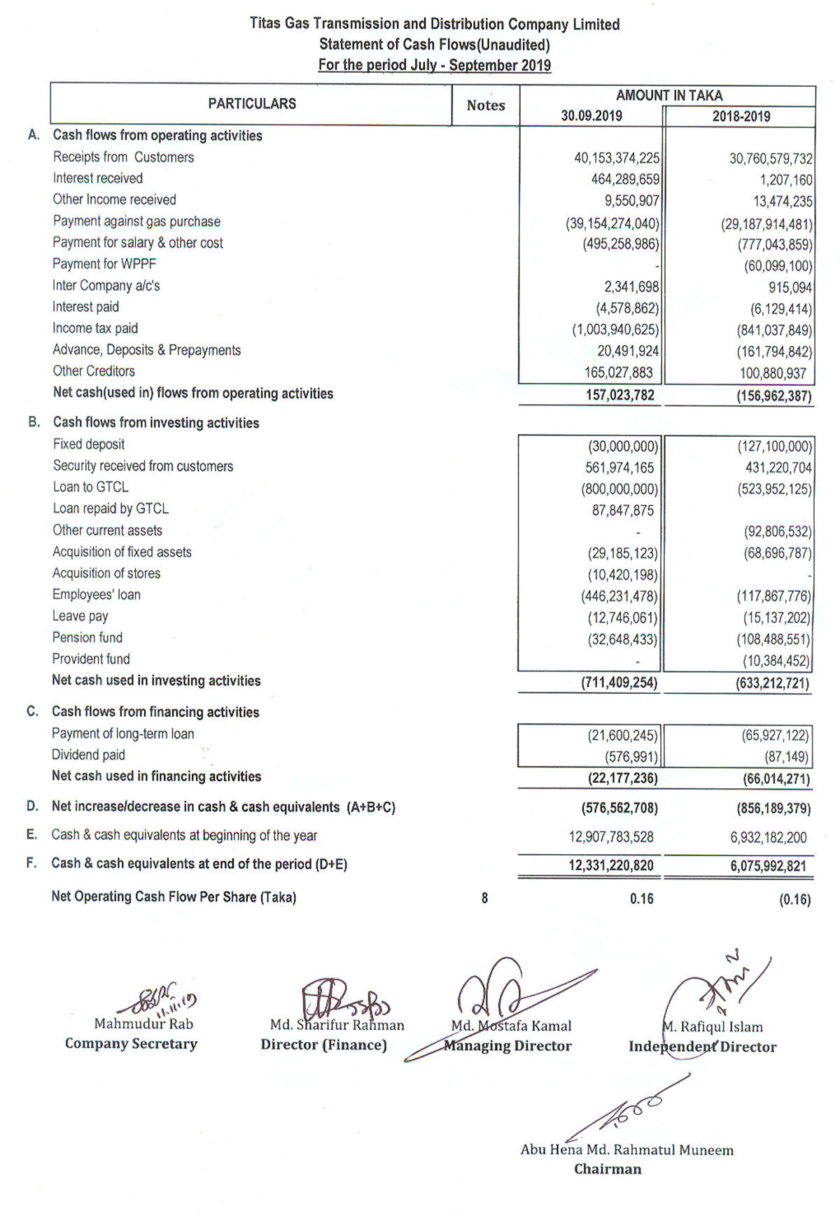 Statement of Financial Position Titas Gas Transmission & Dist. Co. Ltd