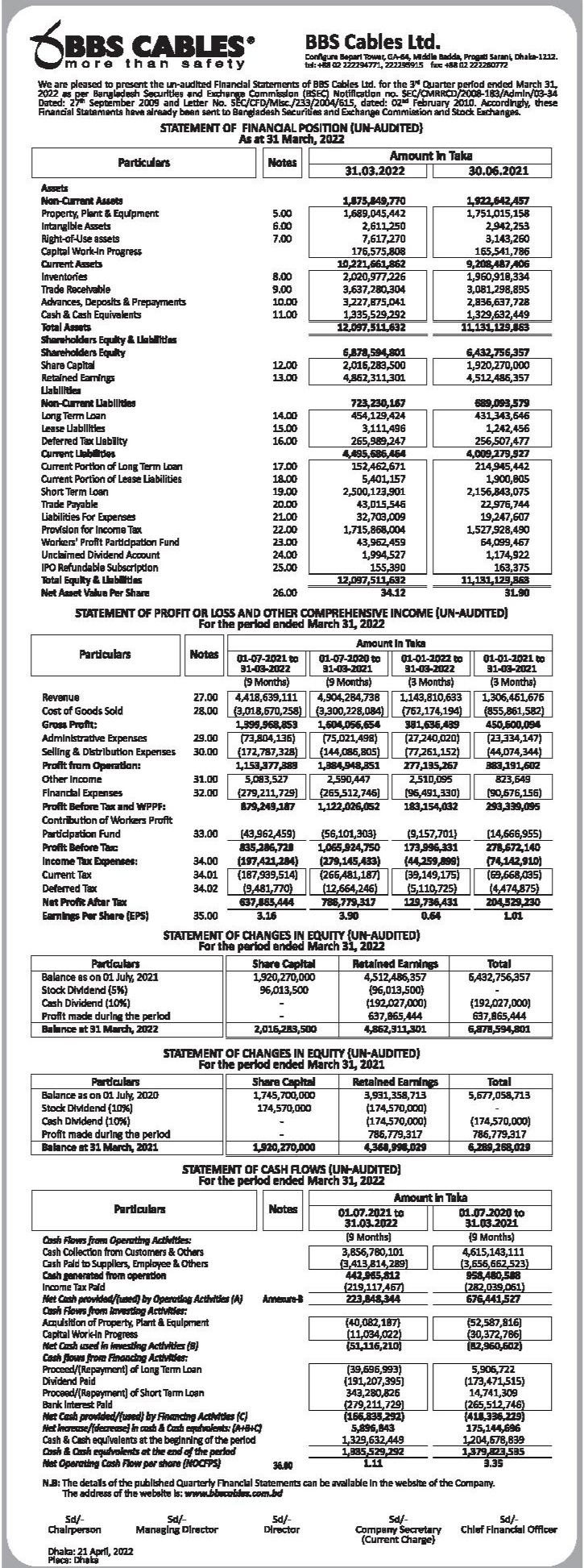 Statement of Financial Position (Un-audited) of BBS Cables Ltd.