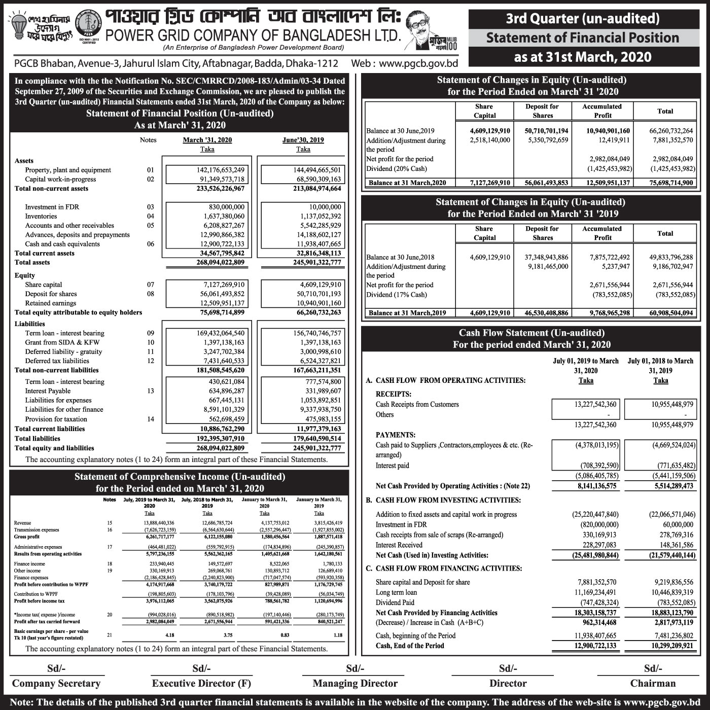 Q2 Un-audited Financial Statements of Power Grid Company of Bangladesh Ltd
