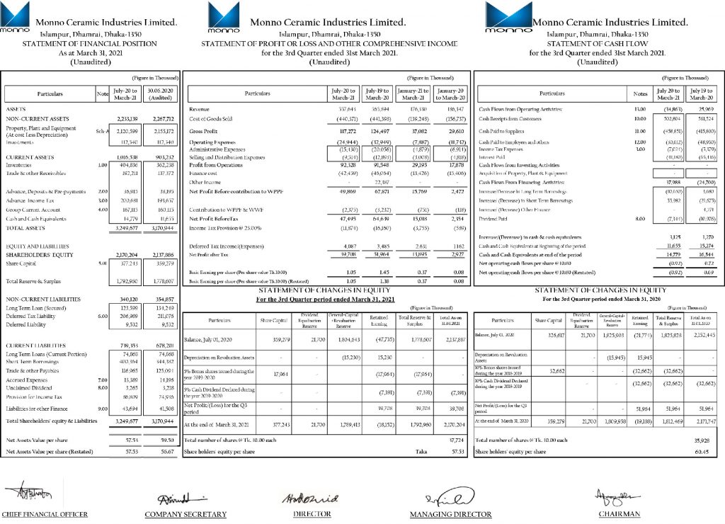 Q1 Financial Statements (Un-audited) of Monno Ceramic Industries Ltd.