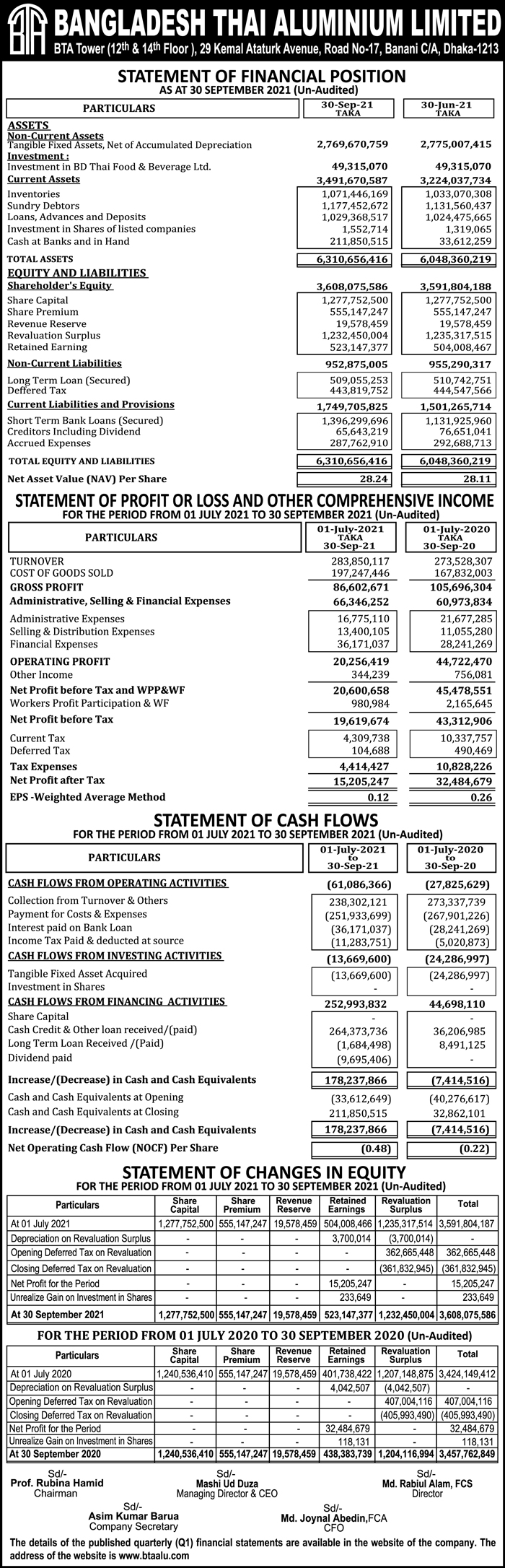 Statement Of Financial Position Bangladesh Thai Aluminium