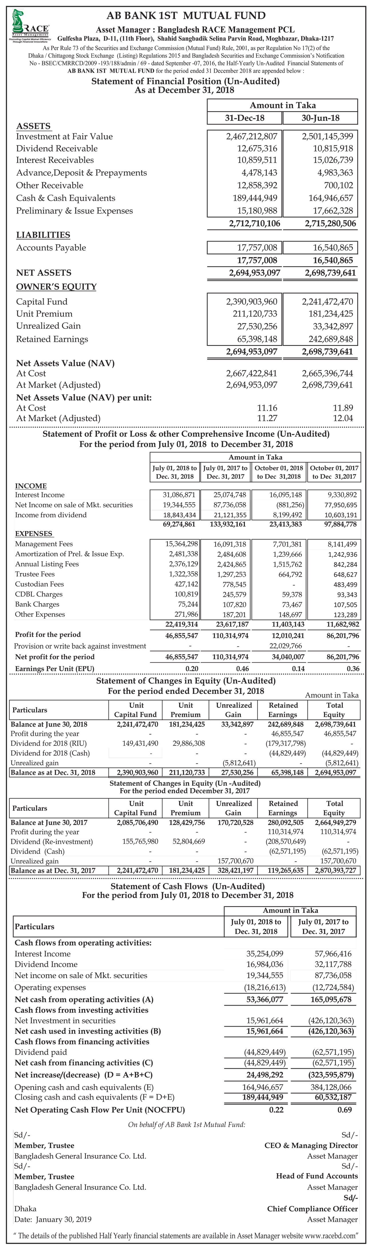 Statements of Financial Position (Un-audited) of AB Bank 1st Mutual fund