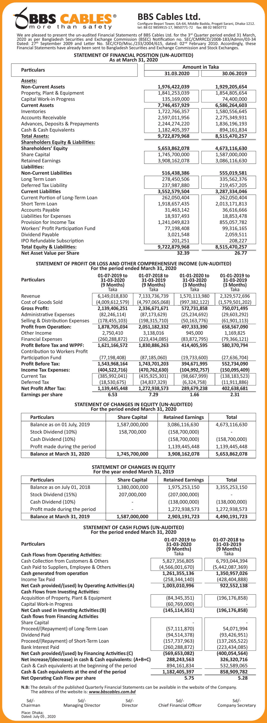 Statements of Financial Position (Un-audited) of BBS Cables Ltd