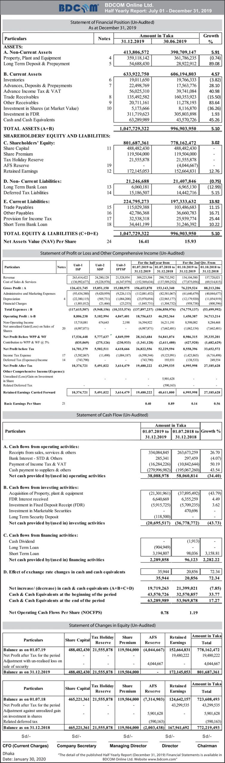Statement of Financial Position (Un-Audited) of BDCOM Online Ltd