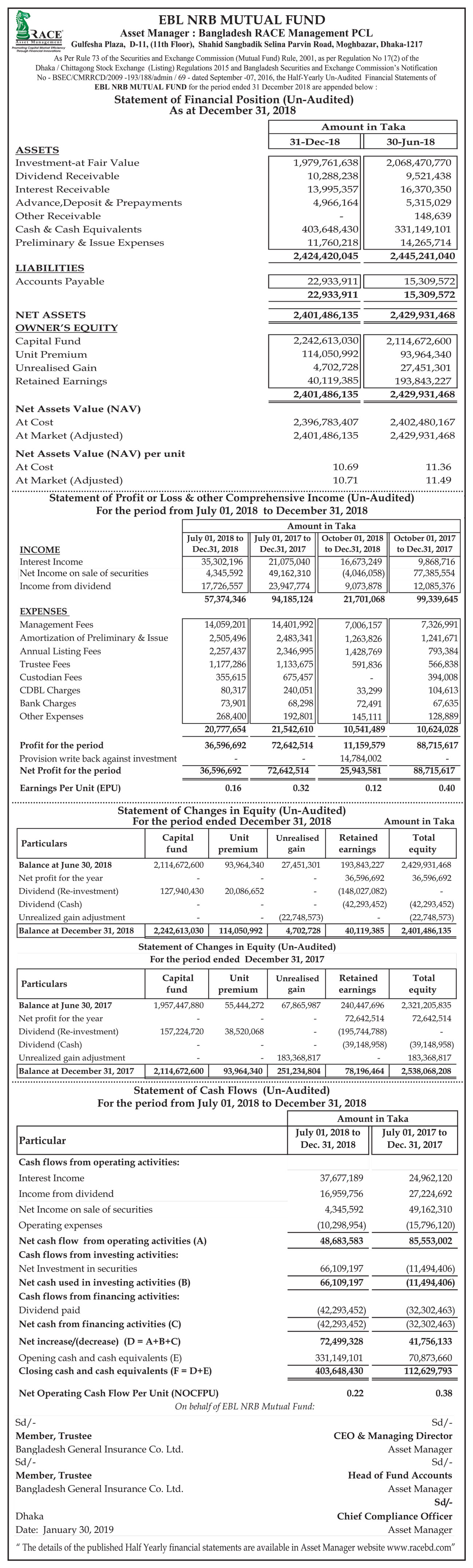 Un-audited Statements of Financial Position of EBL NRB Mutual Fund