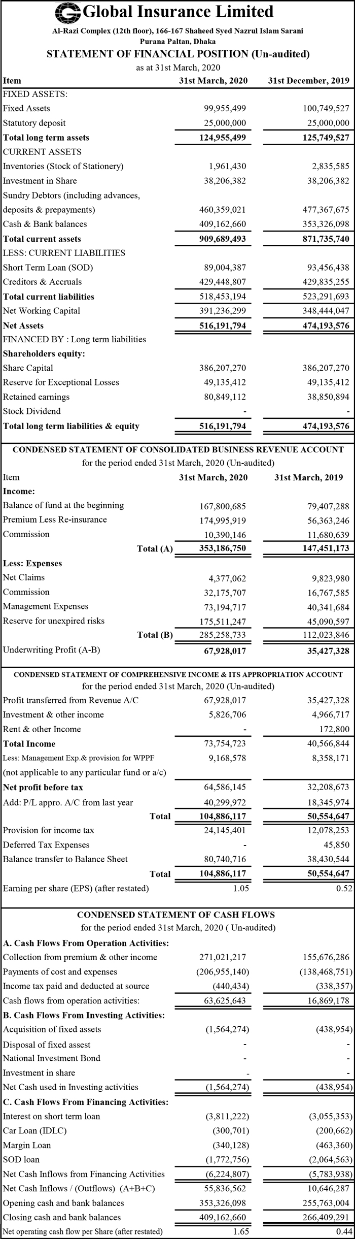 Statements of Financial Position (Un-audited) of Global Insurance Ltd