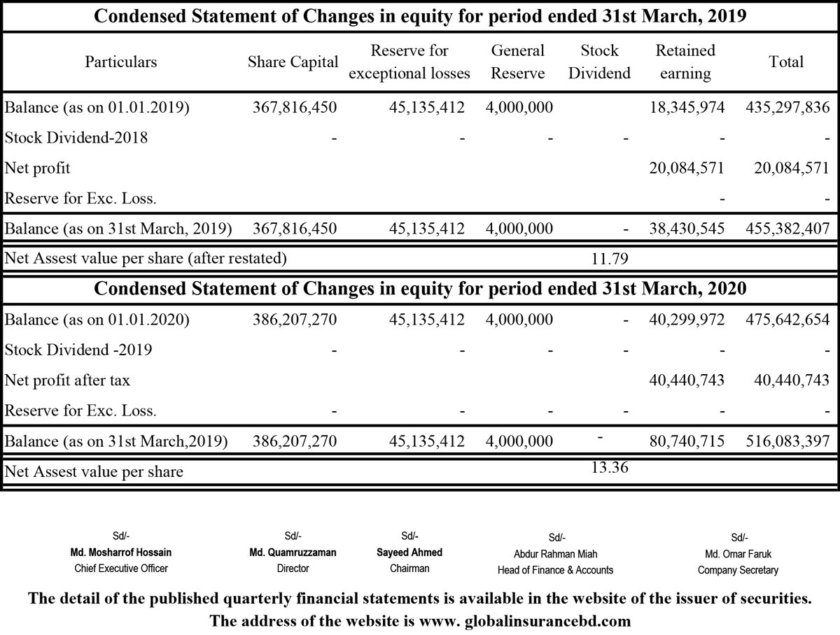 Condensed Statement of Financial Position of Global Insurance Ltd