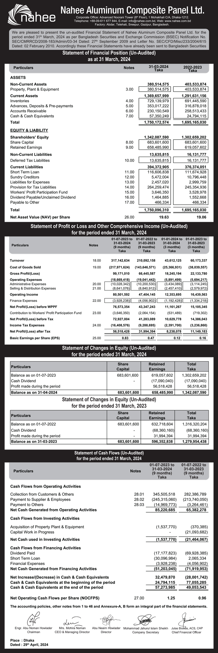 Statements of Financial Position (Un-Audited) of Nahee Aluminum Composite Panel Ltd
