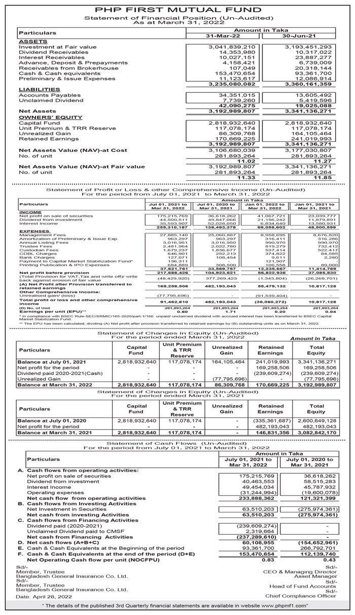 Un-audited Statements of Financial Position of PHP First Mutual Fund