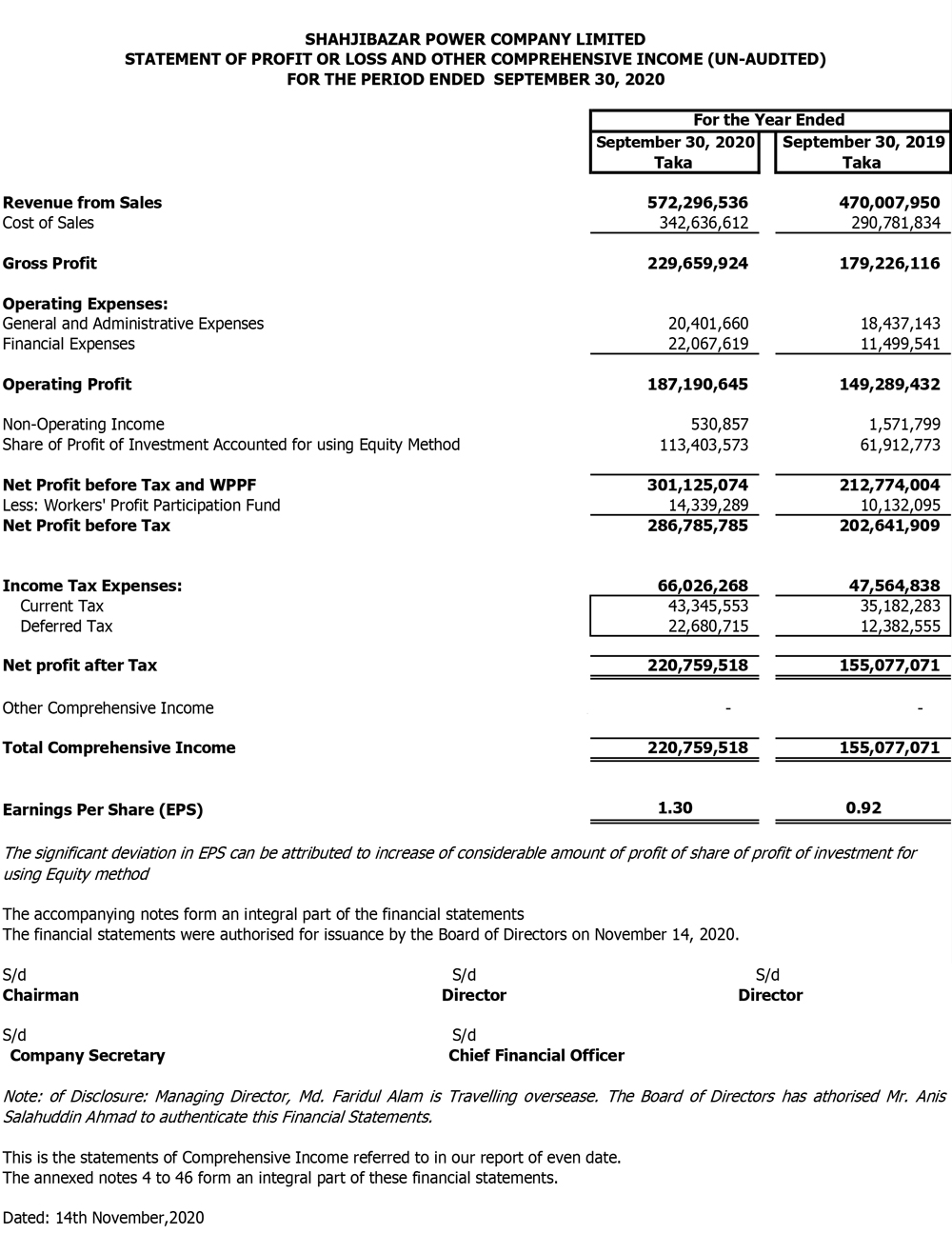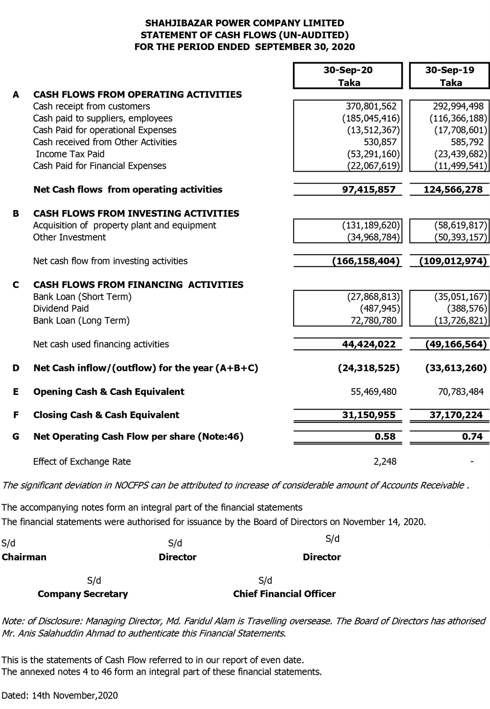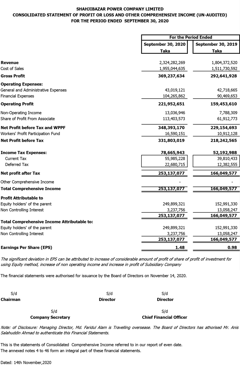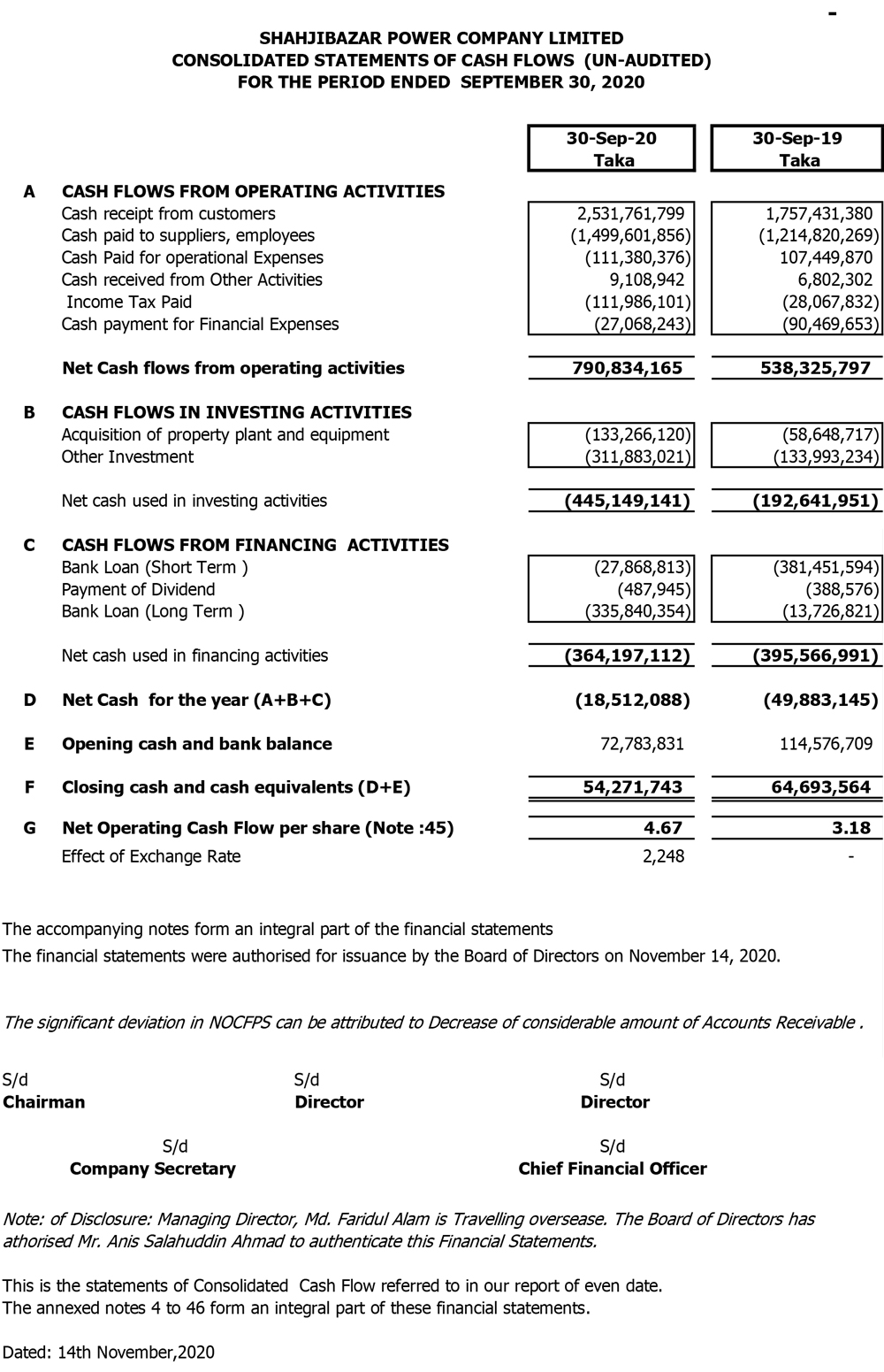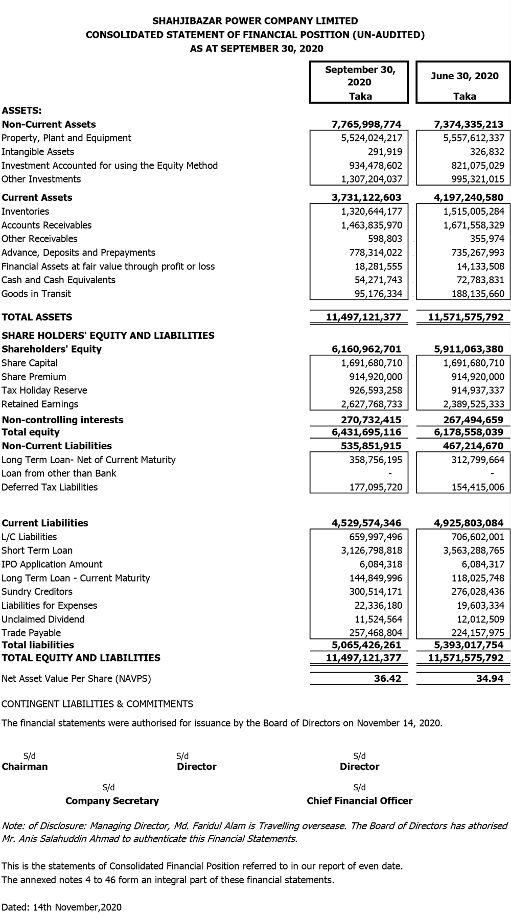 Q3 Un-audited Financial Statements of Shahjibazar Power Co. Ltd