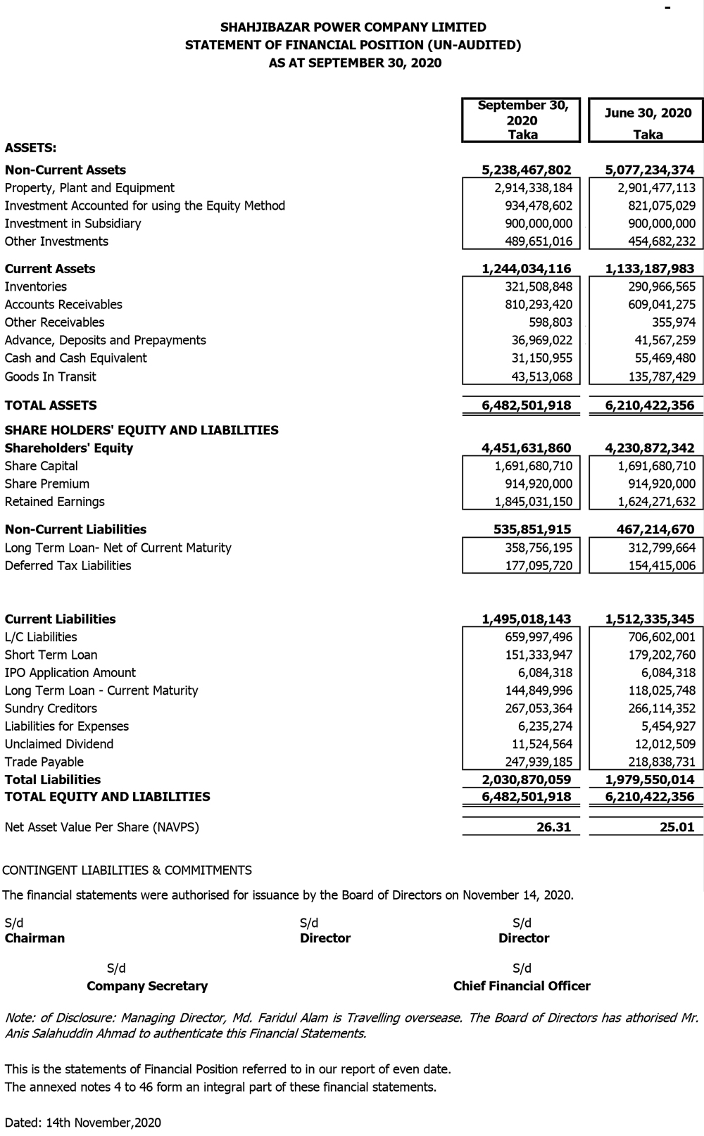Q2 Un-audited Financial Statements of Shahjibazar Power Co. Ltd