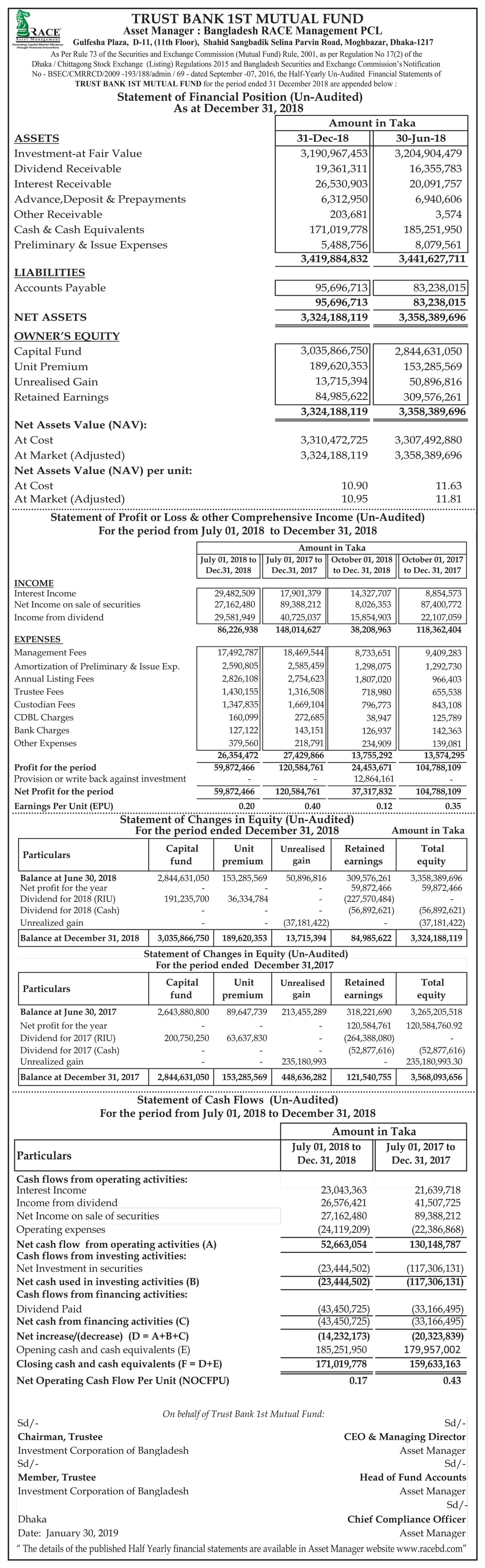 Statements of Financial Position (Un-audited) of Trust Bank 1st Mutual Fund