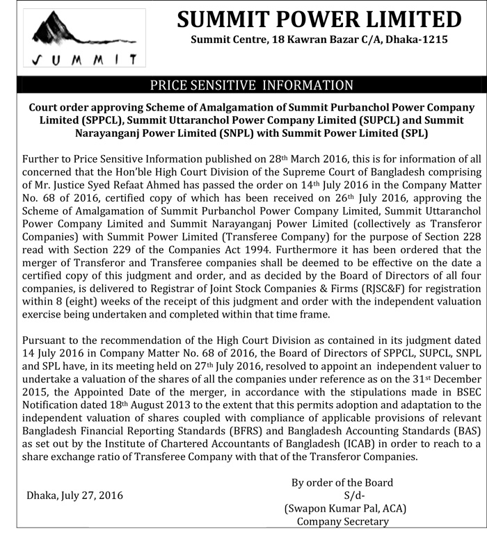 SUMMIT POWER LIMITED PRICE SENSITIVE INFORMATION