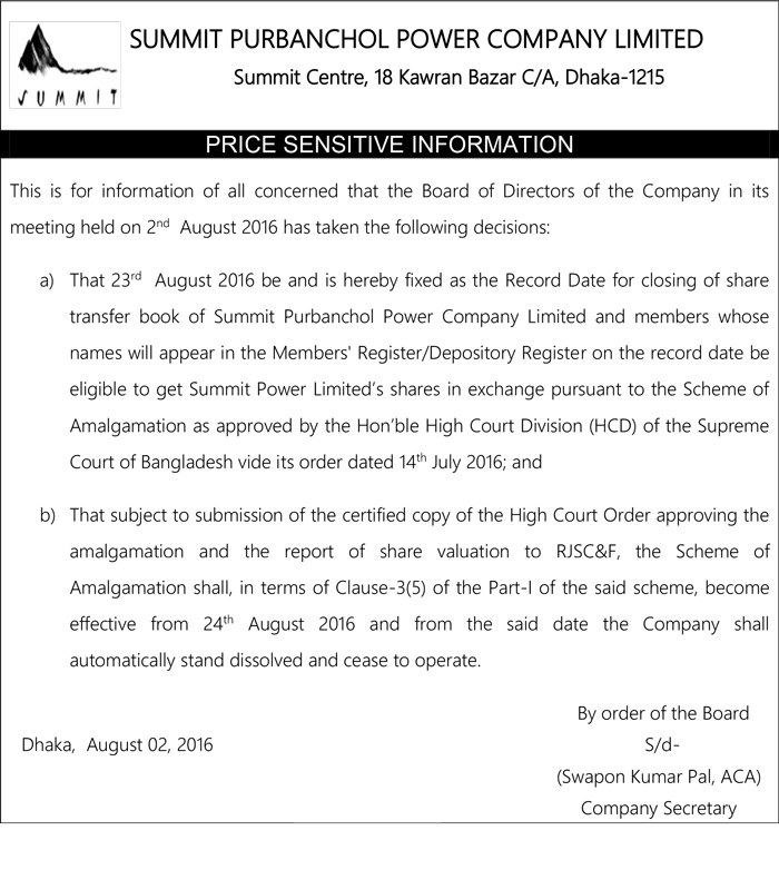 Summit Purbanchol Power Company Ltd. Price sensitive information