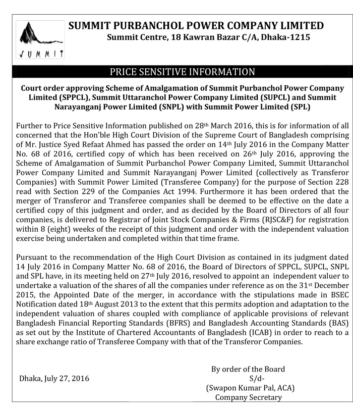 Summit Purbanchol Power Company Limited Price Sensitive Information