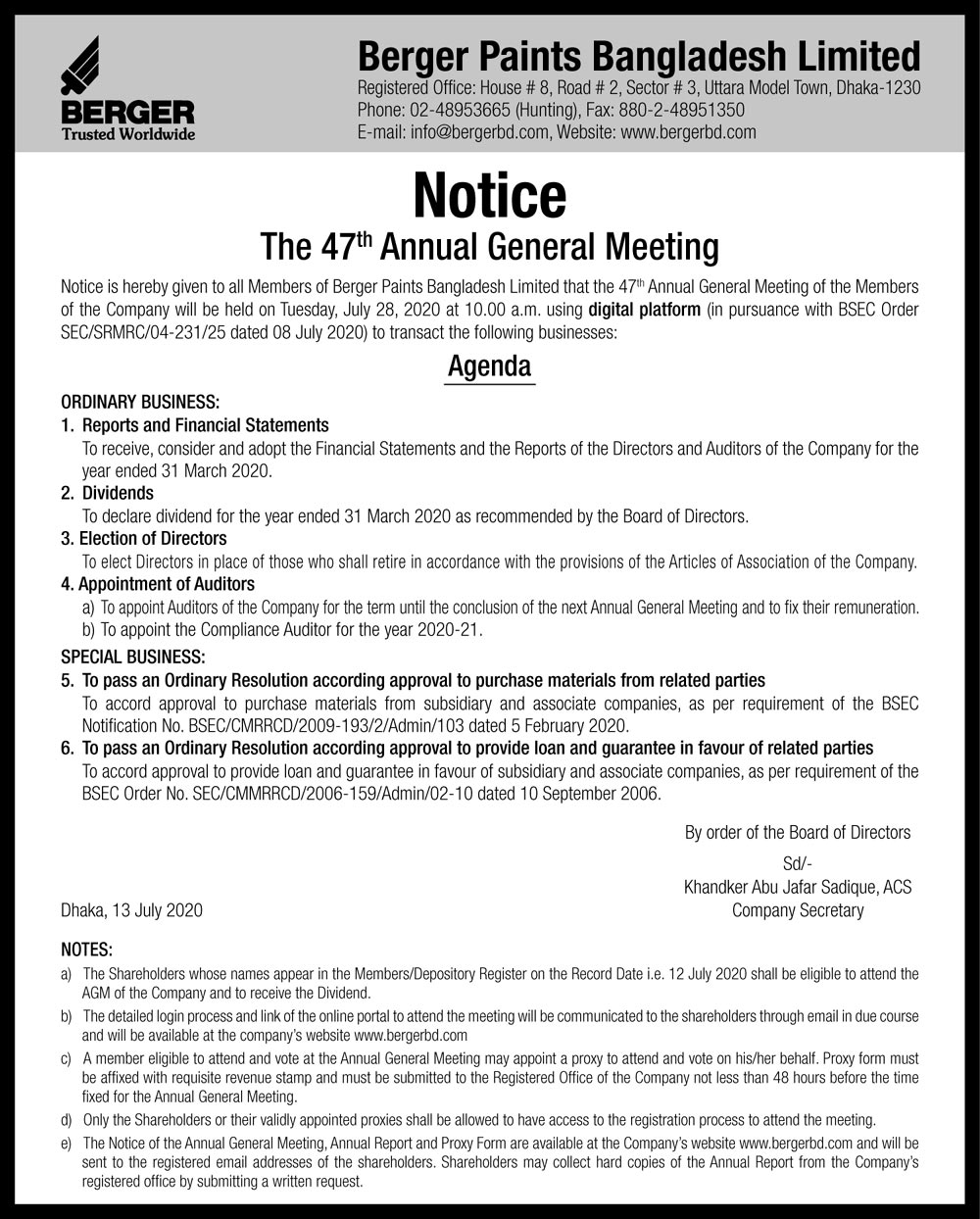Notice of the 50th AGM of Berger Paints Bangladesh Limited