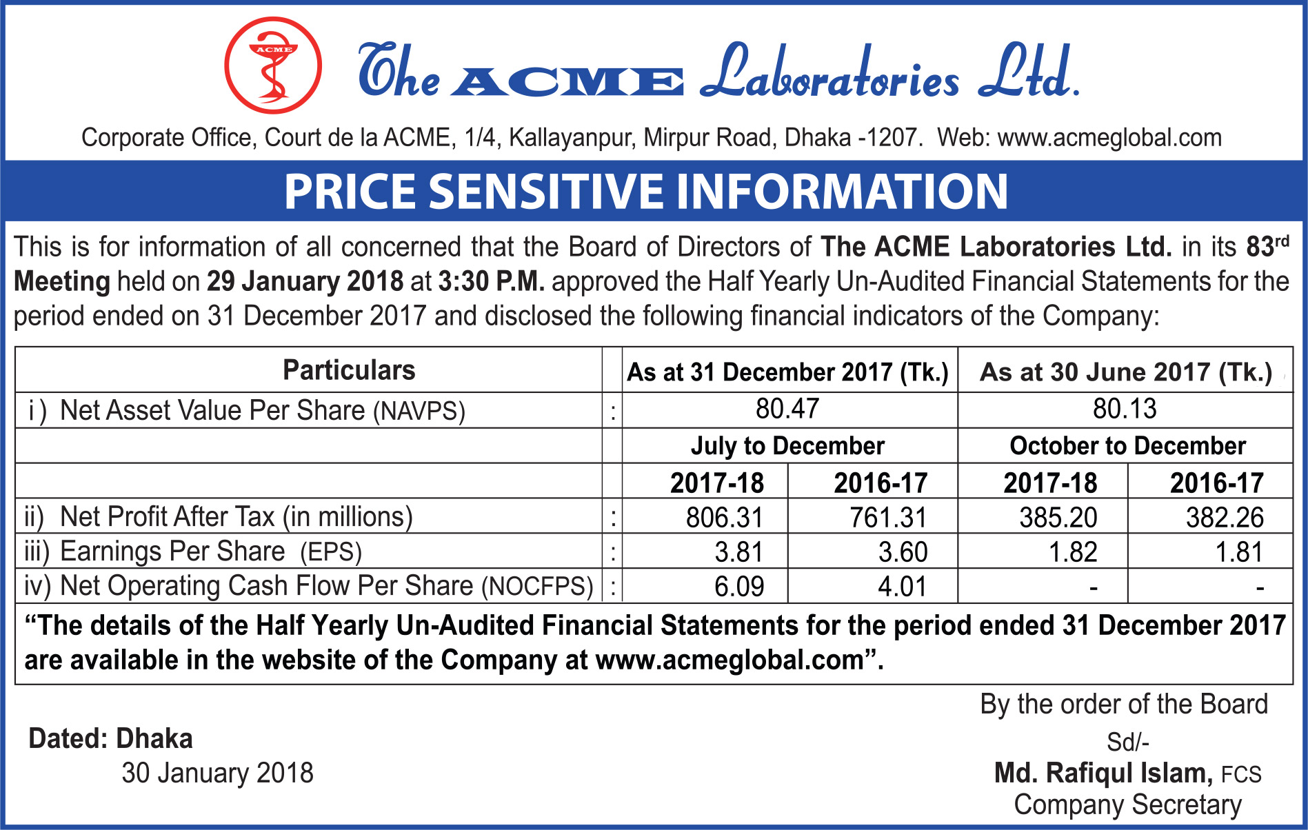 Price Sensitive Information of The ACME Laboratories Ltd.