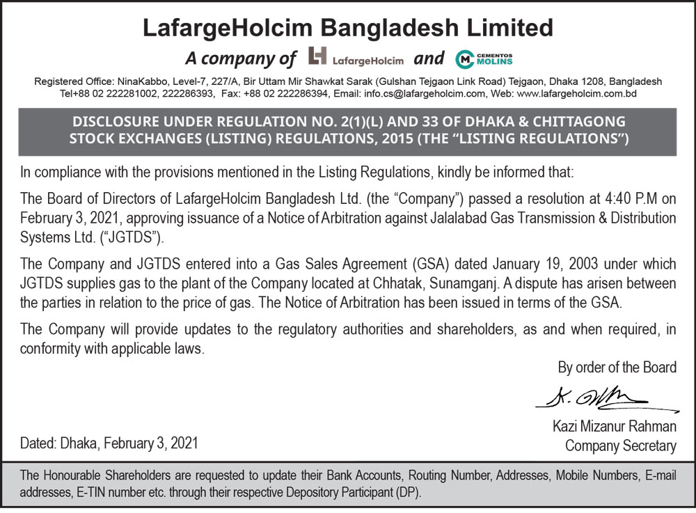 Disclosure under regulation no. 2(1)(L) & 33 of Dhaka & Chittagong Stock Exchanges (Listing) Regulations, 2015 (The “Listing Regulations”)