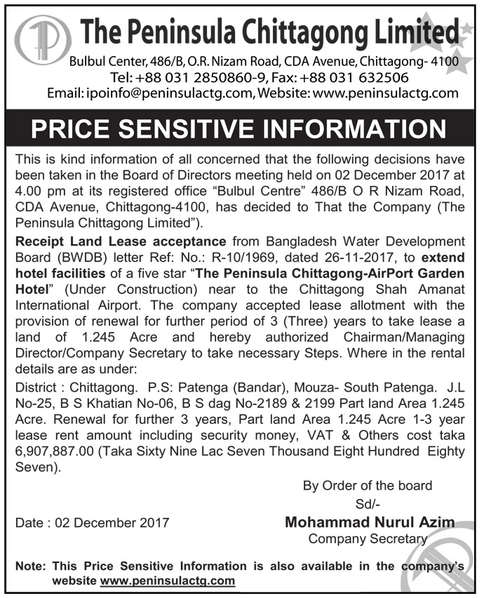 Price Sensitive Information of The Peninsula Chittagong Limited