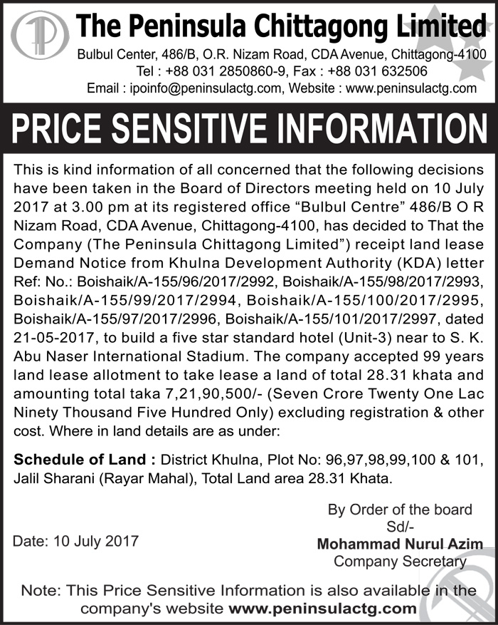 Price Sensitive Information of The Peninsula Chittagong Limited