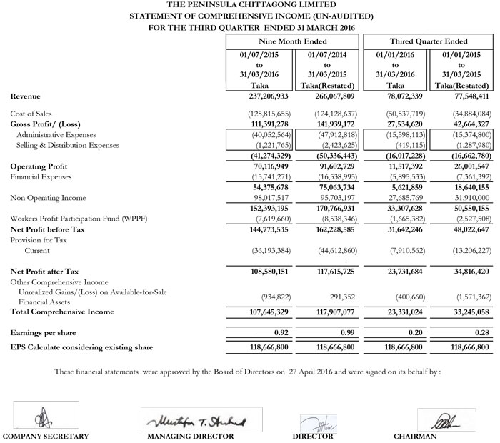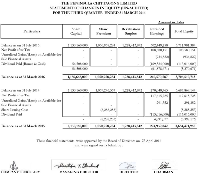 Q1 Unaudited Financial Statements of The Peninsula Chittagong Limited