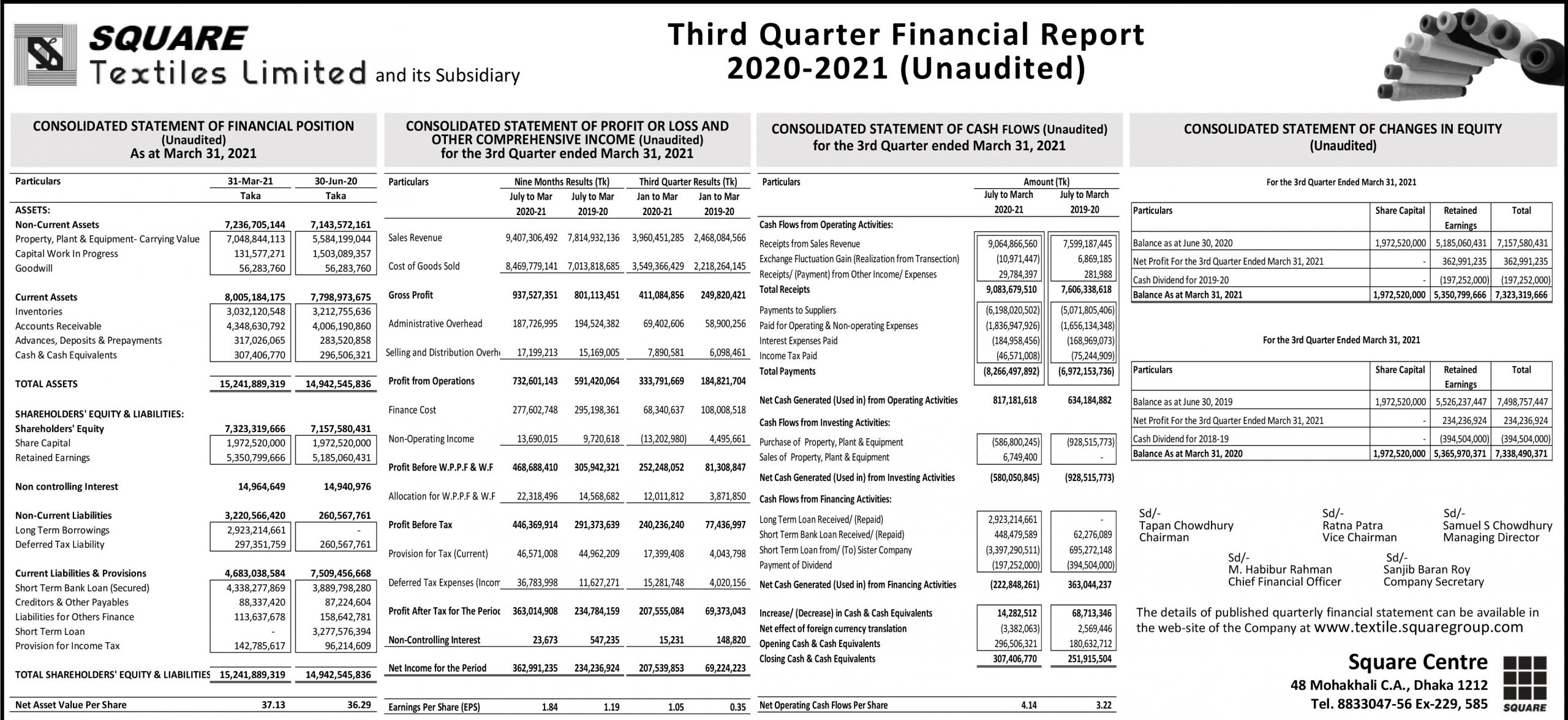 Q1 Financial Statements (Un-audited) of Square Textiles Ltd.