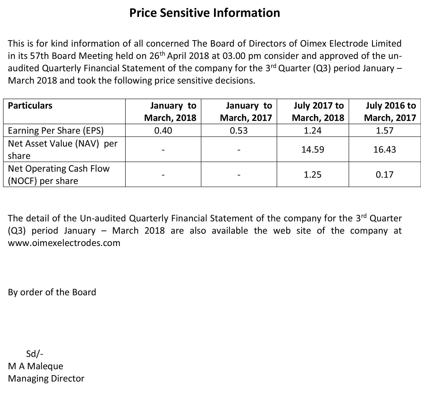 Price Sensitive Information of Oimex Electrode Limited